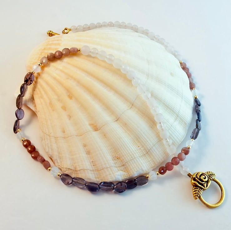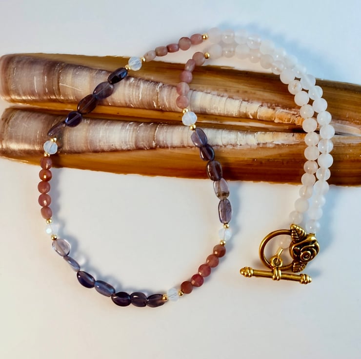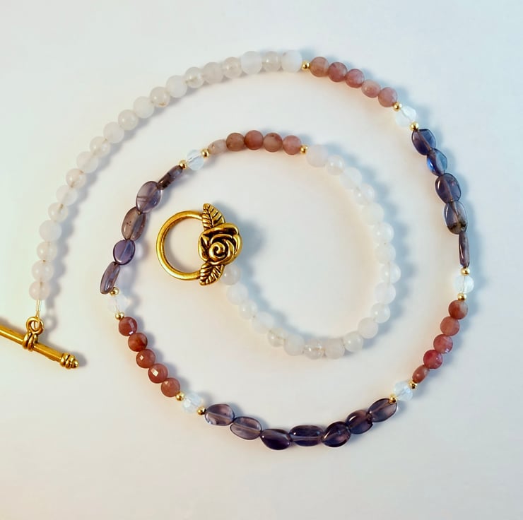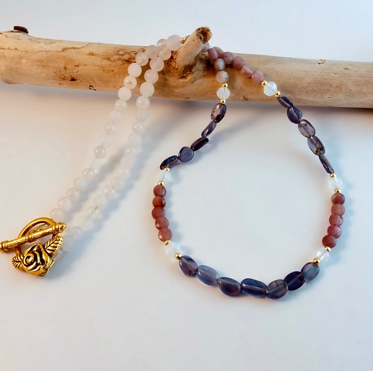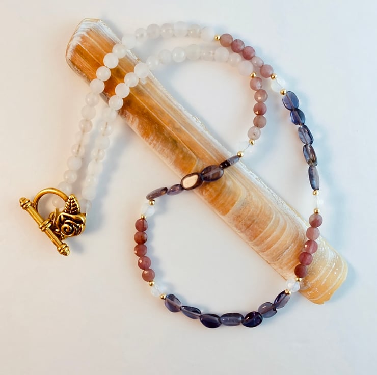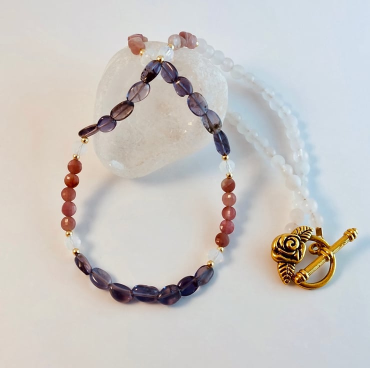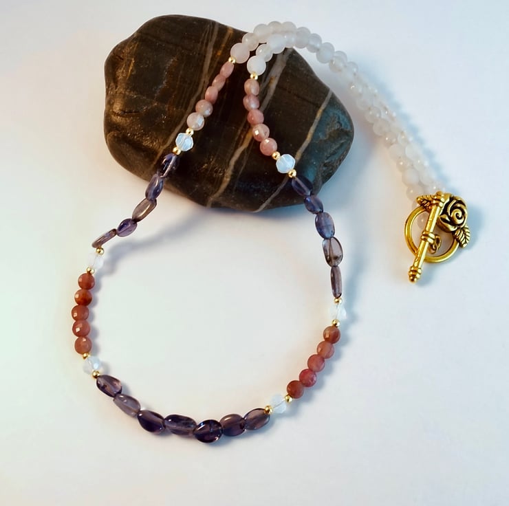 Rows of rough-cut, semi-translucent, 5-7mm Iolite ovals and 4mm micro-faceted Pink Tourmaline coins are separated by 4mm faceted Opalite rondelles and tiny 2mm gold vermeil beads.