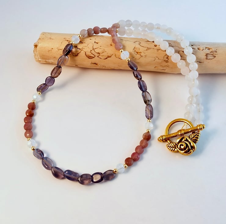 The necklace finishes with 4mm smooth and frosted Rose Quartz, and fastens with a Tibetan rose toggle clasp.