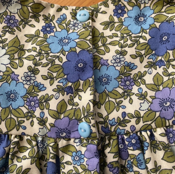 This dress is very blue with a vintage feel to the fabric. The bodice of the dress is lined, the skirt has two ruffles. The bodice is embellished with a few sequins.