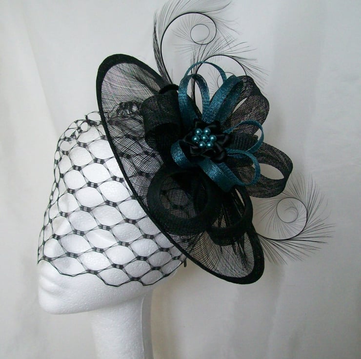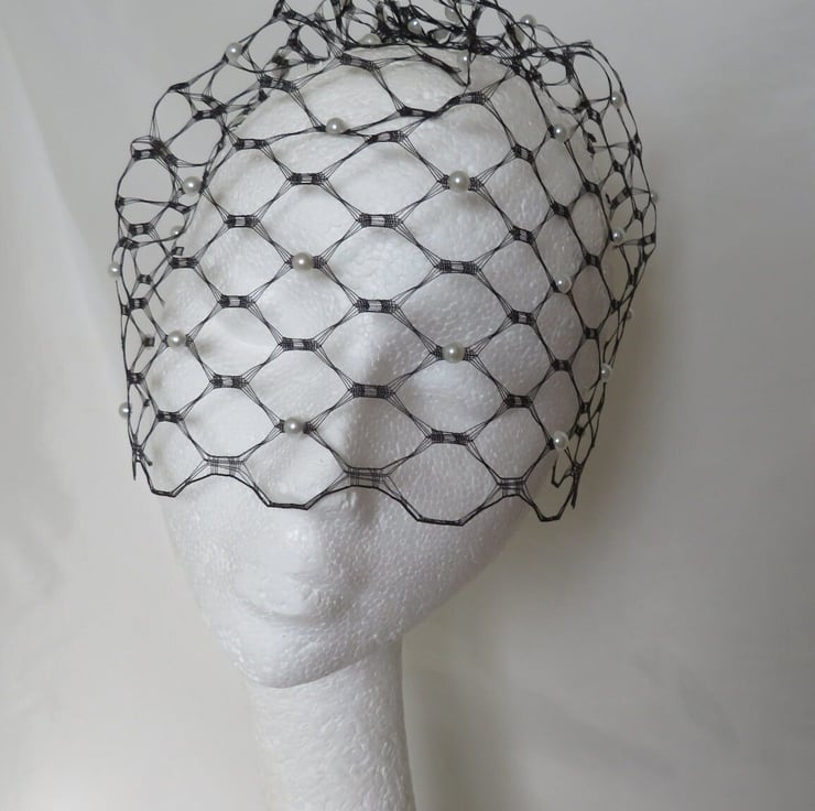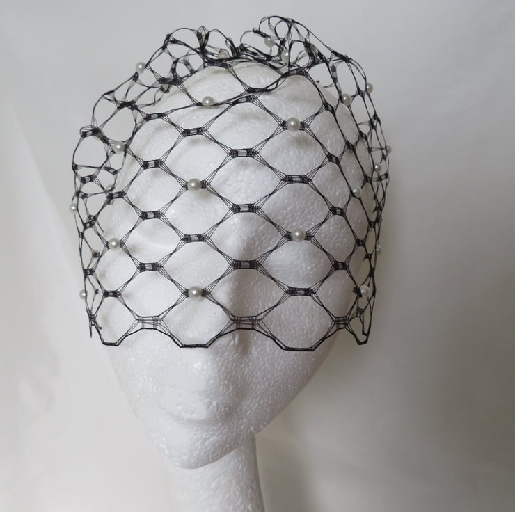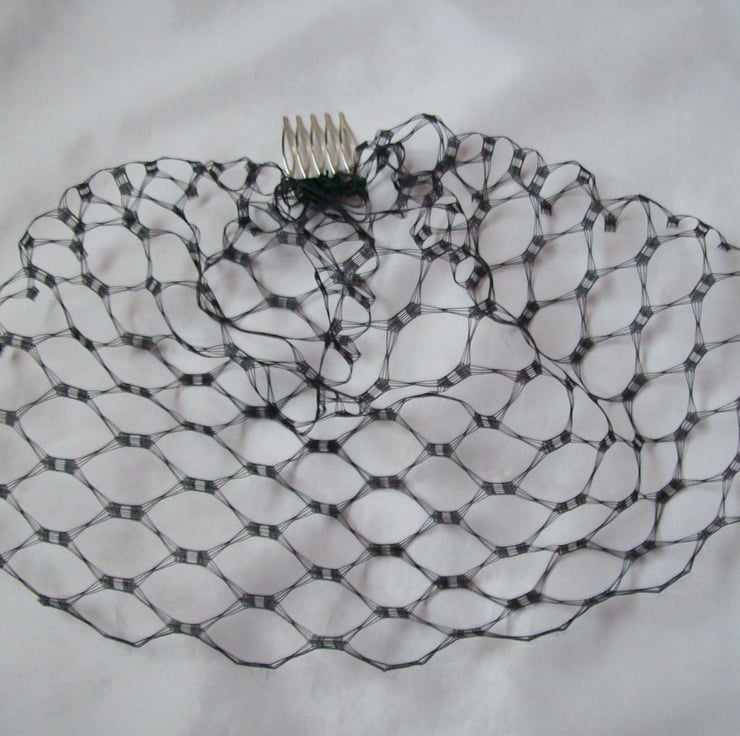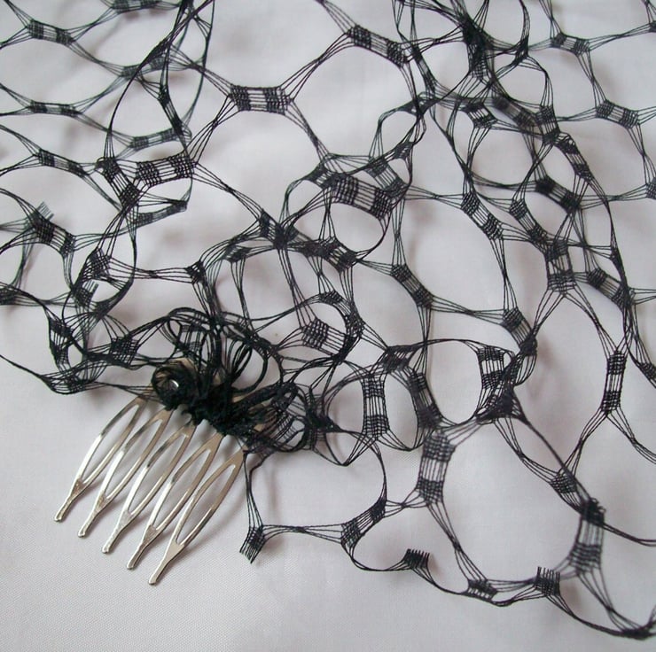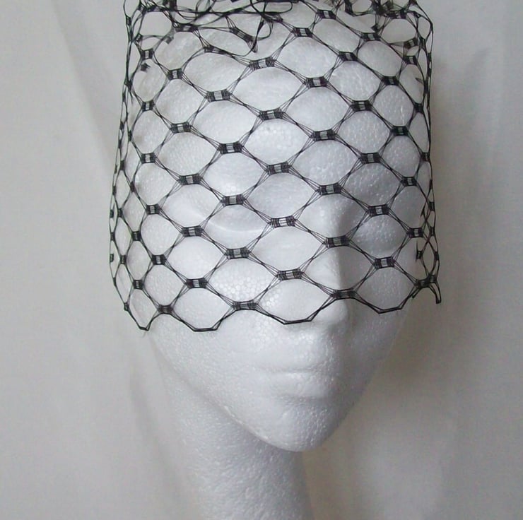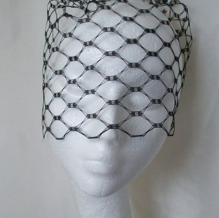 This is a short cocktail style veil made from larger hole black waffle weave millinery veiling.