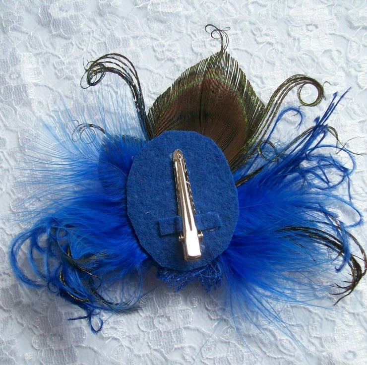 Created with a large trimmed peacock eye feather, curled ostrich fronds, royal blue fluffy feathers and a small trimmed peacock eye feather.