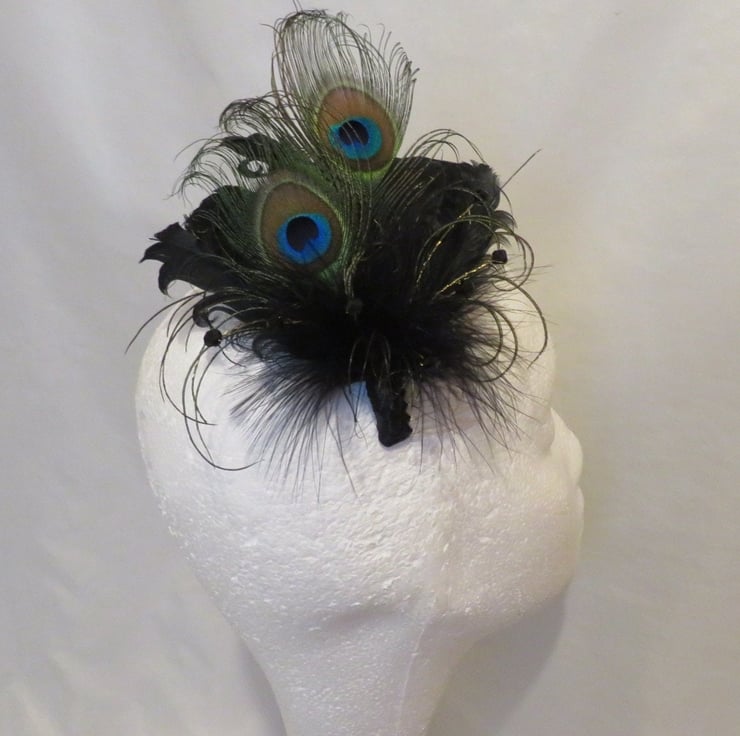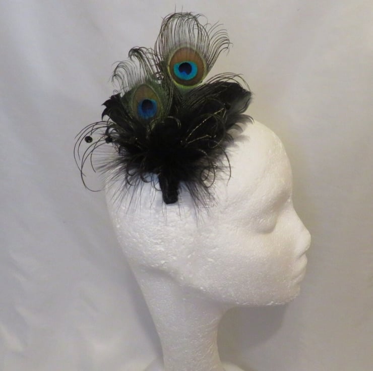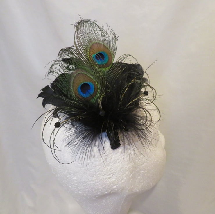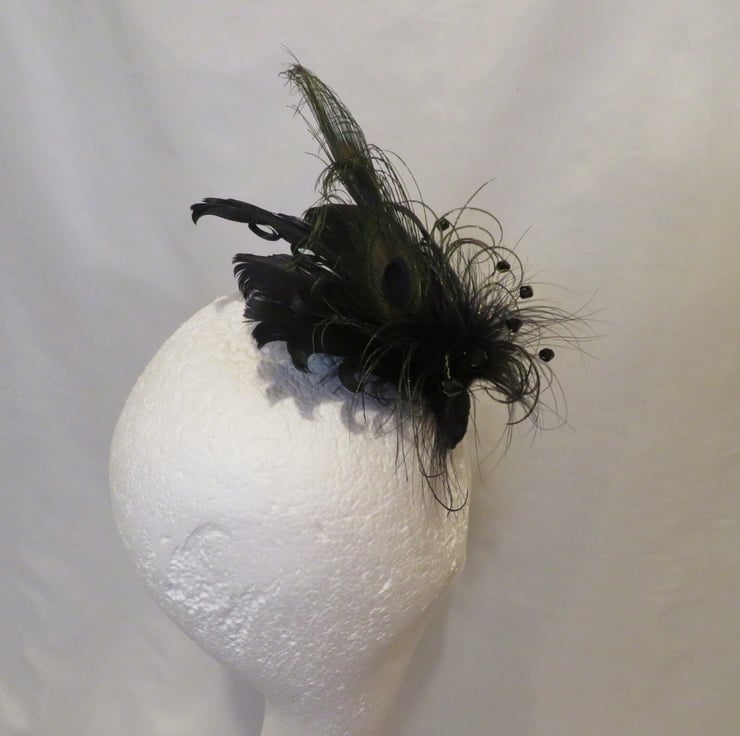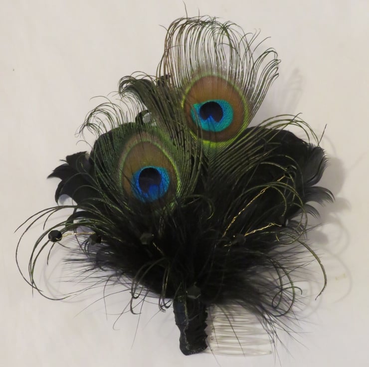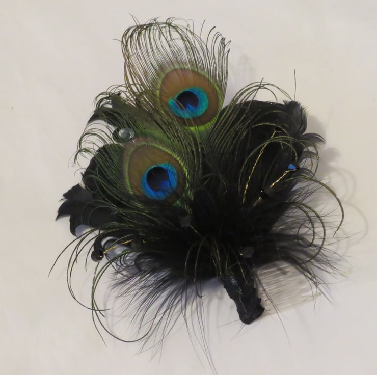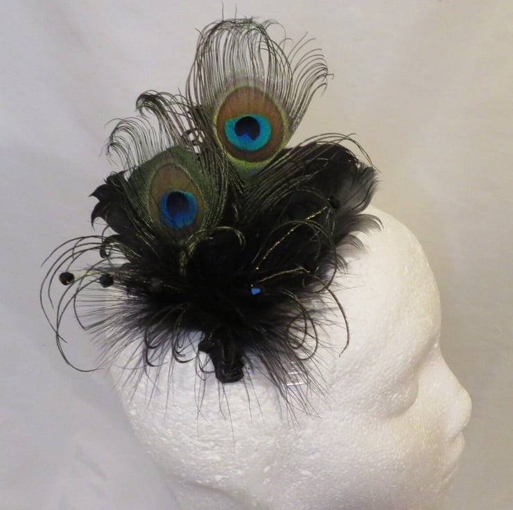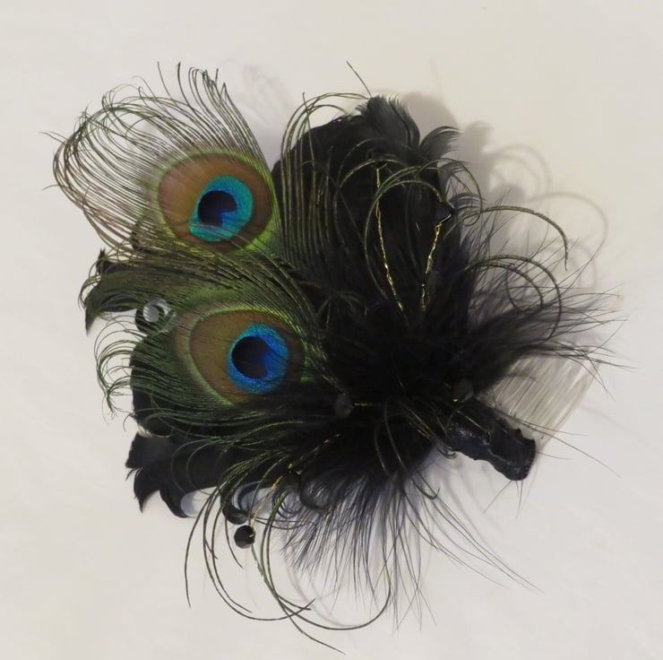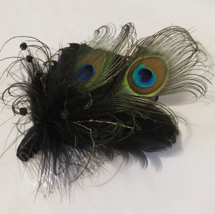 Made with curled black goose feathers, two small green & bronze tinged peacock 'Eye' feathers and curled peacock fronds/flume, black fluff feathers and gold wire stems with black crystals.