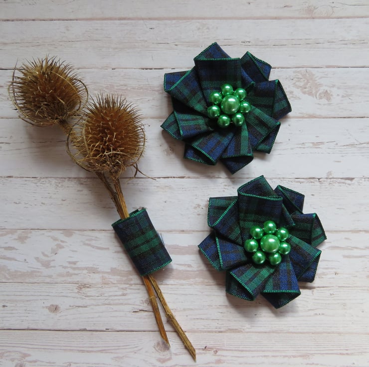 Made with a small circle of black or dark green felt with the clip attached and a handmade and sewn ruffle of Blackwatch tartan ribbon and finished with a choice of a clear or black crystal stud with diamante edging.
