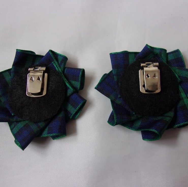 This is for ONE pair of small ribbon ruffle shoe clips in Blackwatch tartan, great for jazzing up a plain pair of shoes.