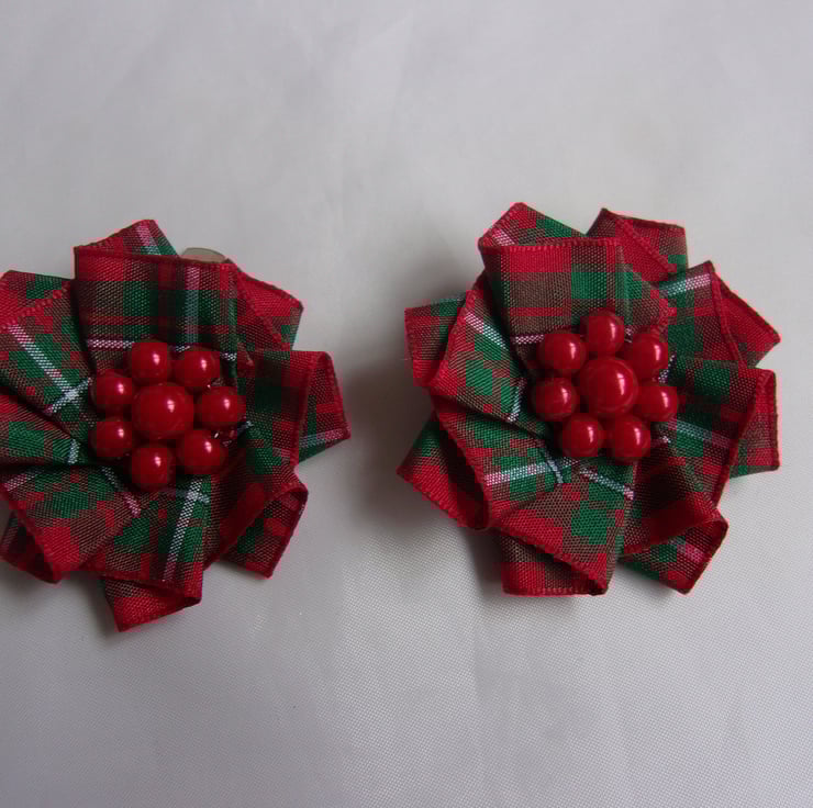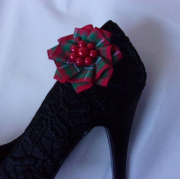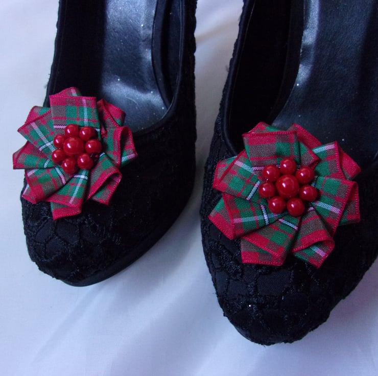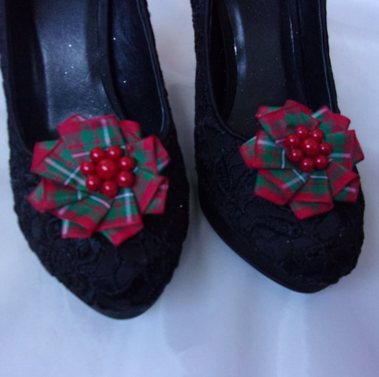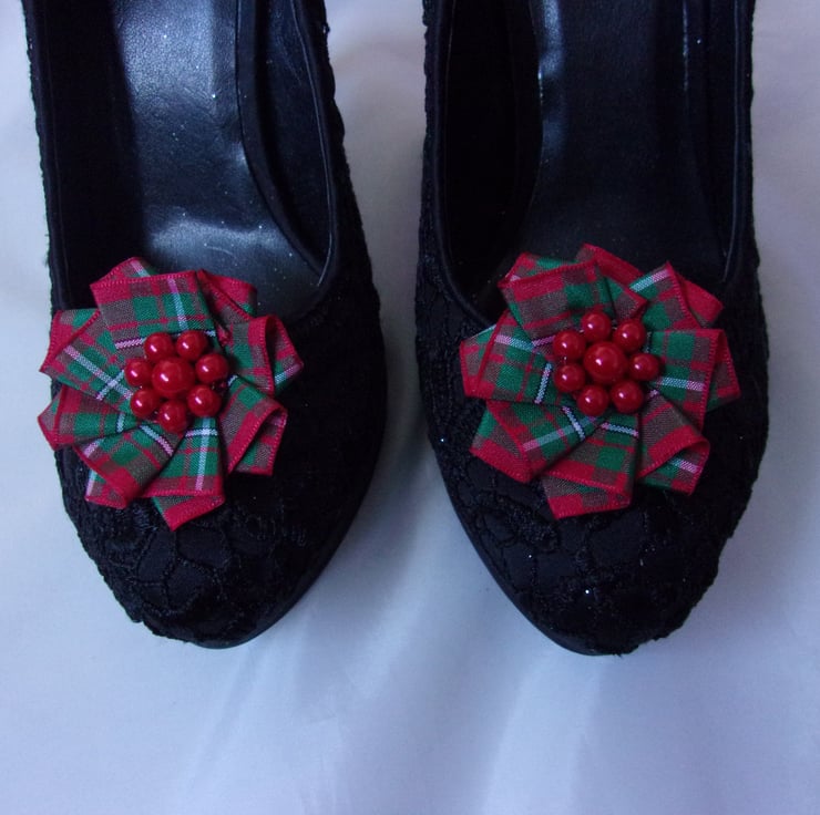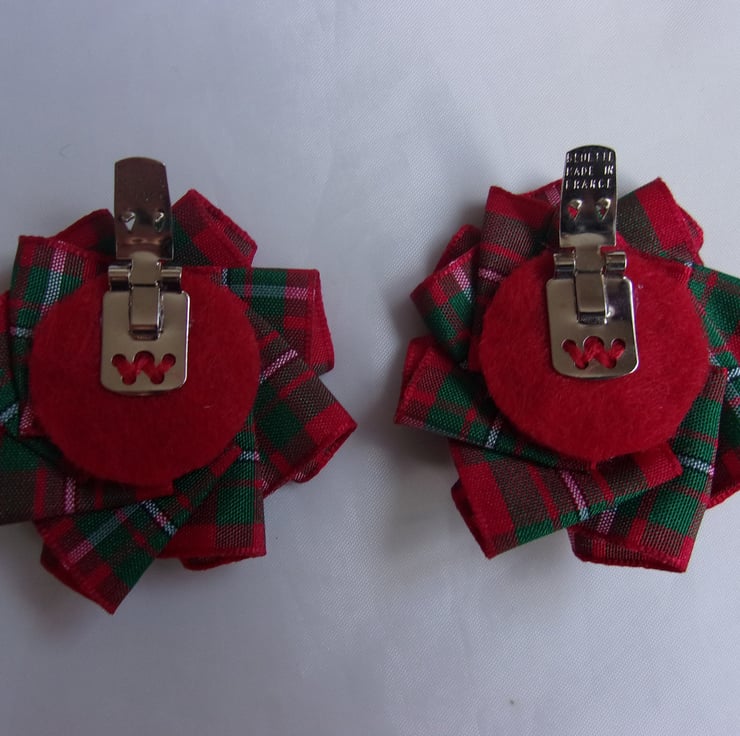 This is for ONE pair of small ribbon ruffle shoe clips in red and dark green MacGregor tartan.
