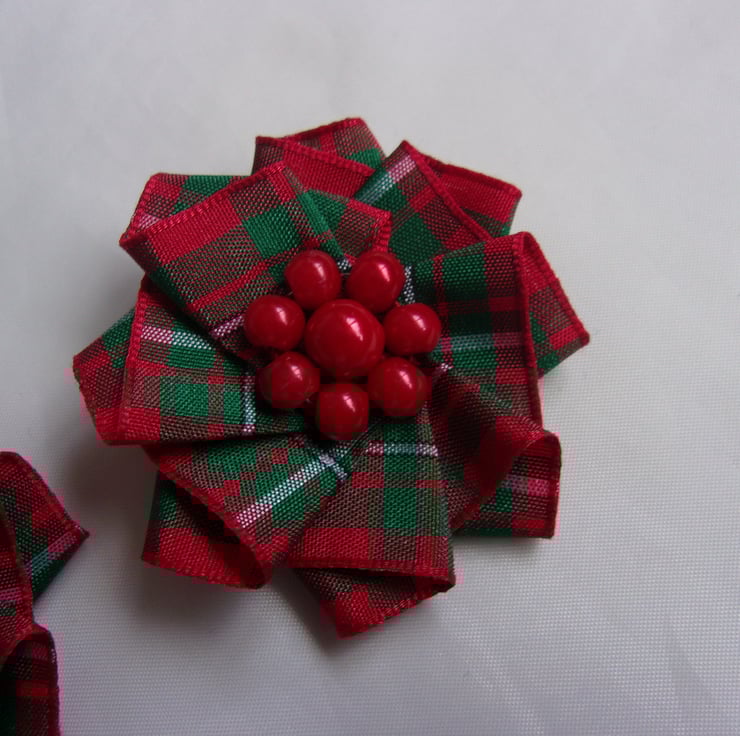 Made with a small circle of red felt with the clip attached and a handmade and sewn ruffle of MacGregor tartan ribbon and finished with a cluster of small red glass pearls.