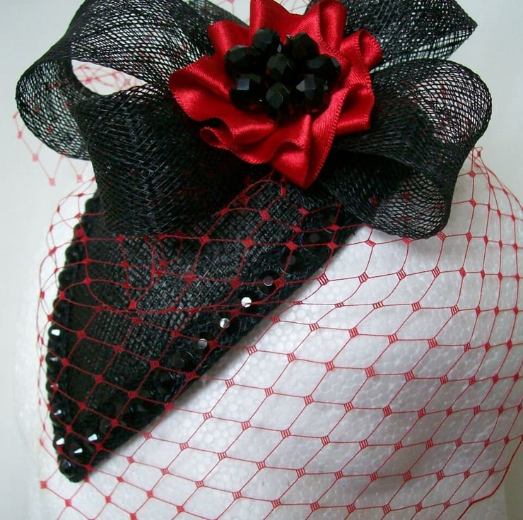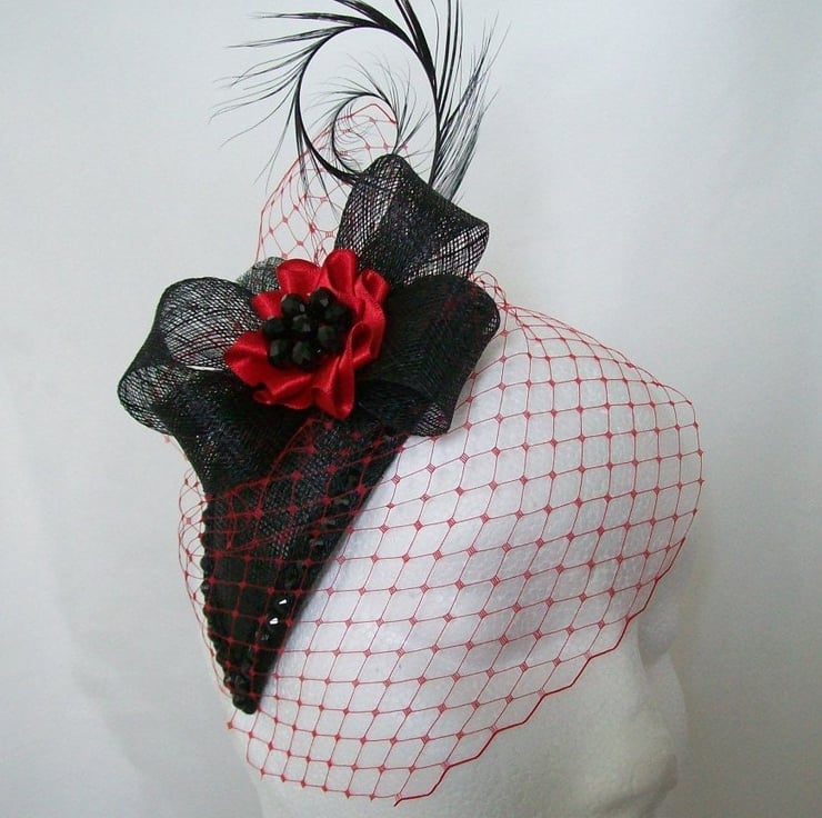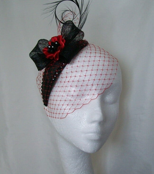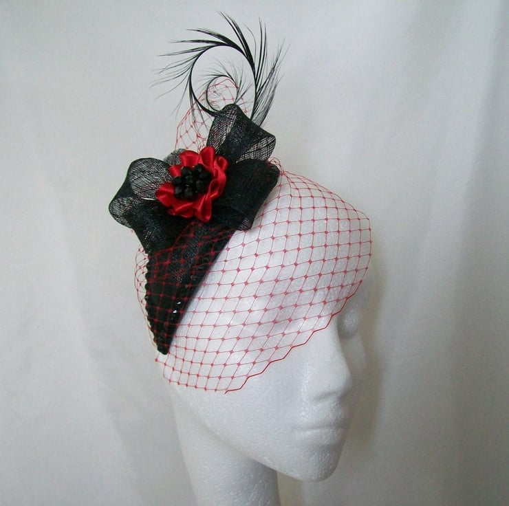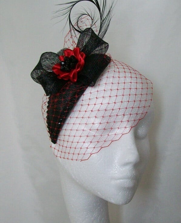 This is an exquisite, elegant and chic hair comb cocktail fascinator mini hat in black & scarlet red.