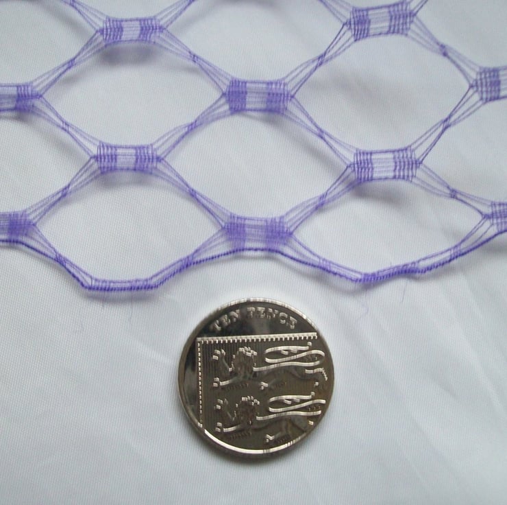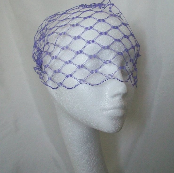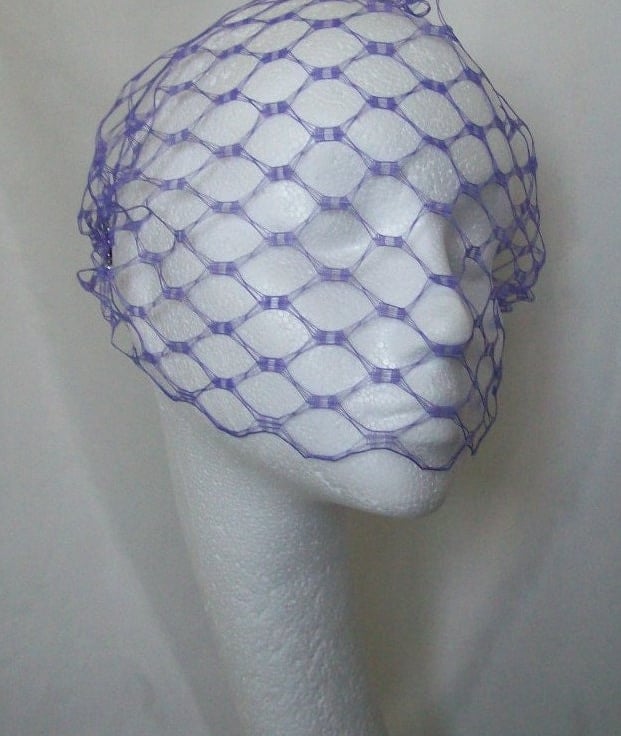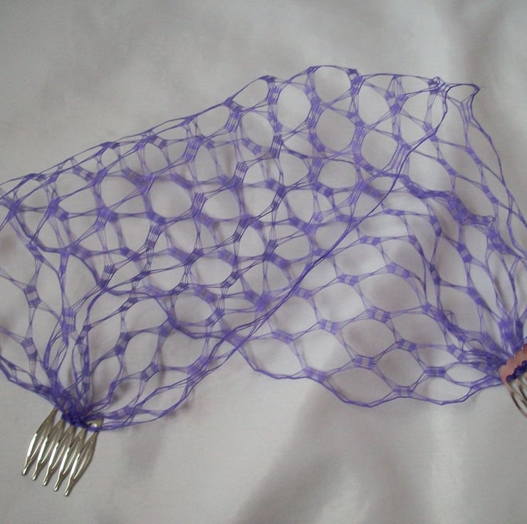 This is a bandeau birdcage style veil made from a light ultraviolet purple soft waffle weave millinery veiling.