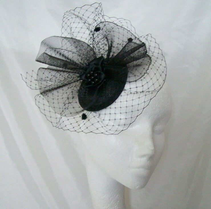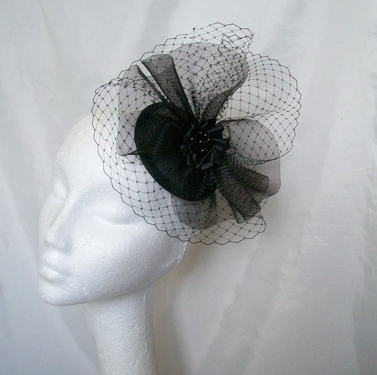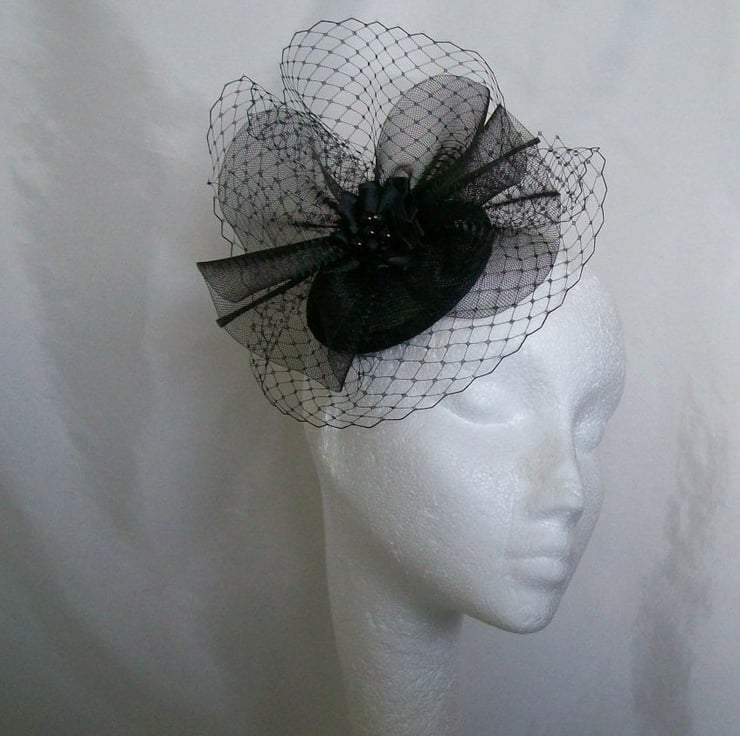 Created with a choux piece of black plain classic veiling, a black crinoline bow swirl, a ruffle of black satin ribbon finished with a choice of a cluster of black pearls or crystal beads