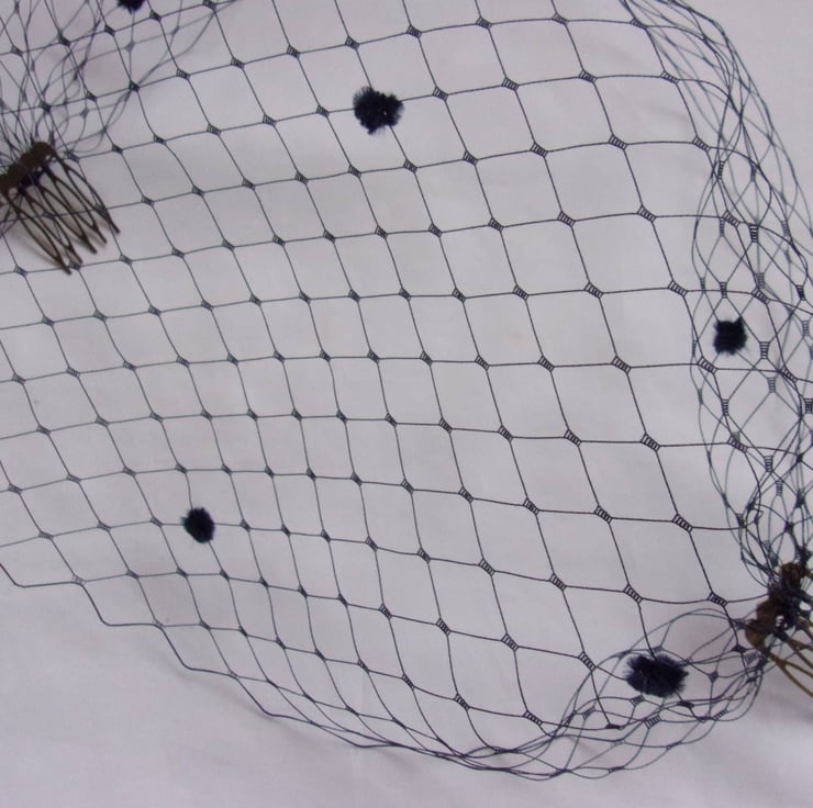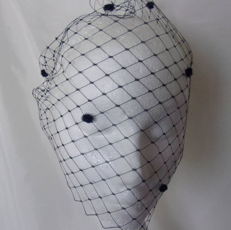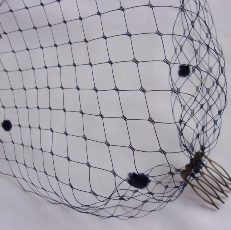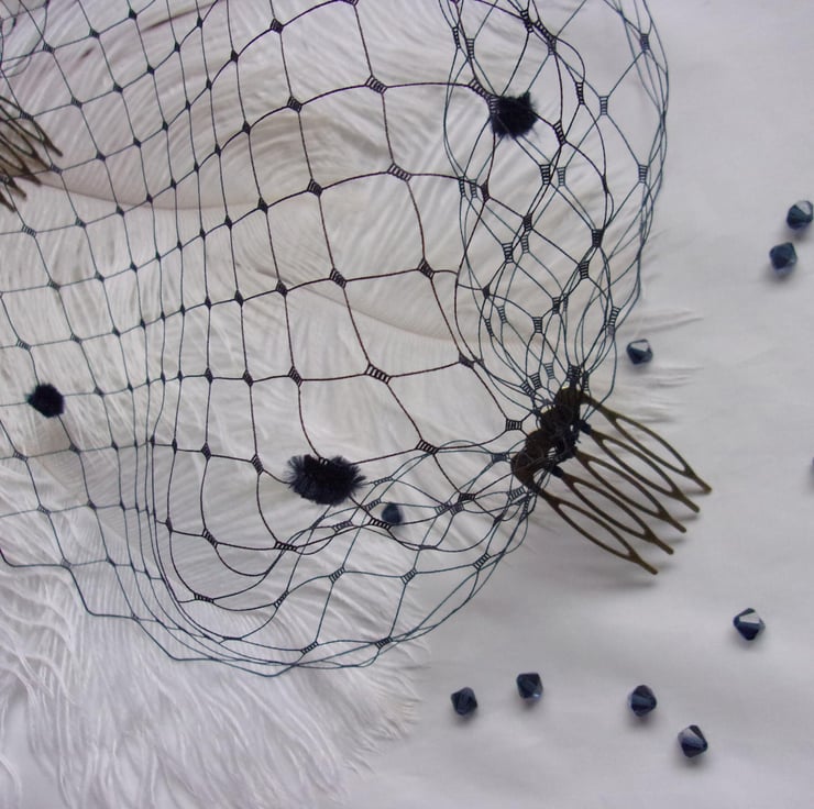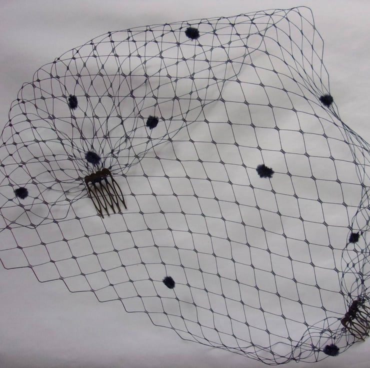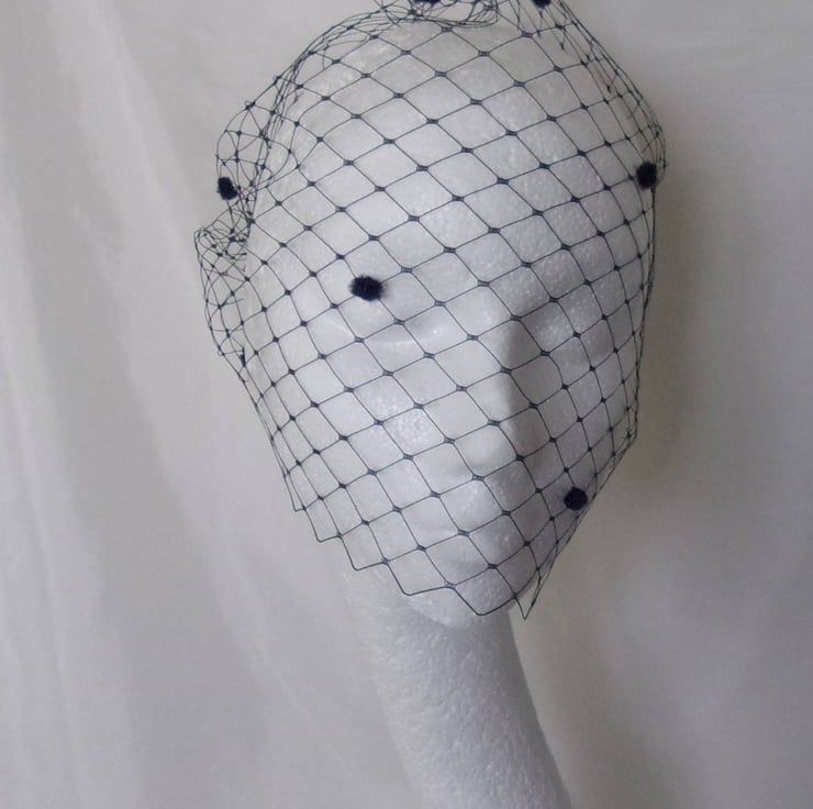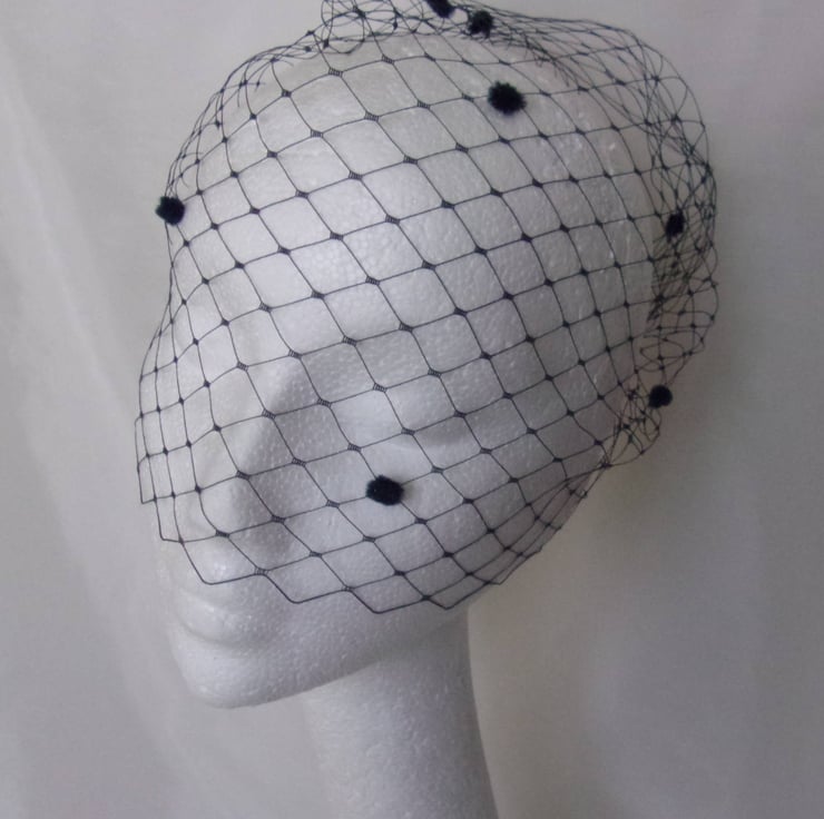 This is a bandeau birdcage style veil made from larger hole, slightly stiffer dark navy blue Merry Widow spotted veiling with chenille spots scattered over it..