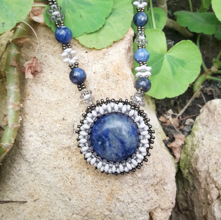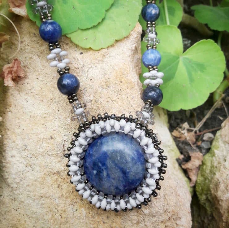 Handmade bead woven gemstone necklace, made using bead embroidery techniques. Deep blue Sodalite cabochon centre piece.