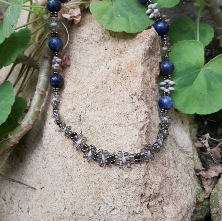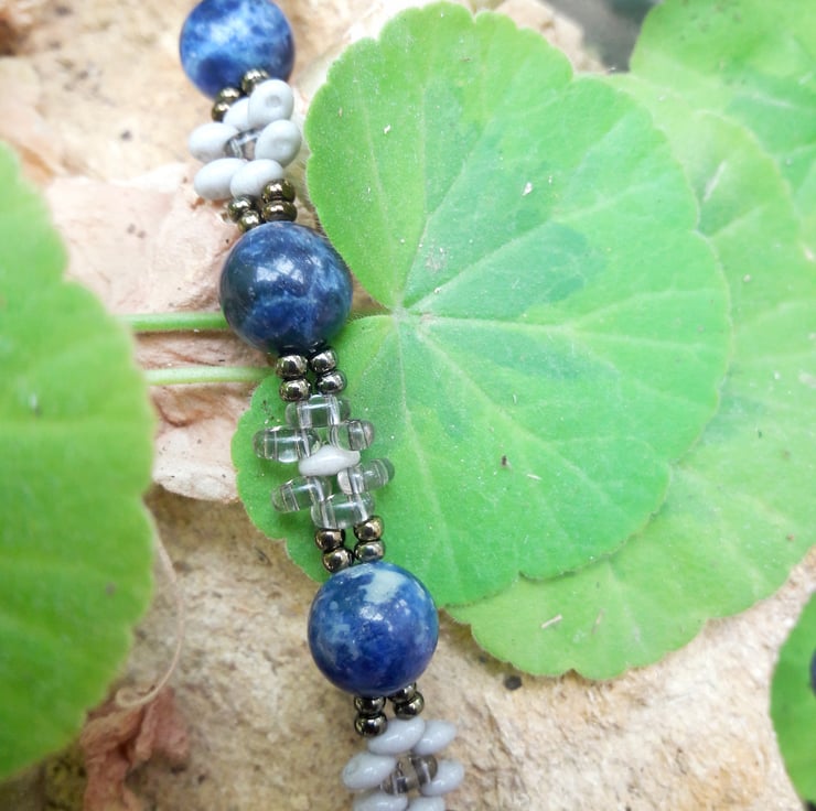 The necklace is a combination of Sodalite 10mm beads, metallic seed beads and twin hole beads.