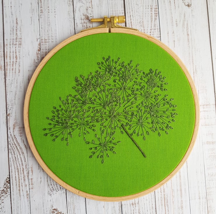 A lively piece of botanical embroidery. Dark slatey green seed heads on a vibrant emerald background.