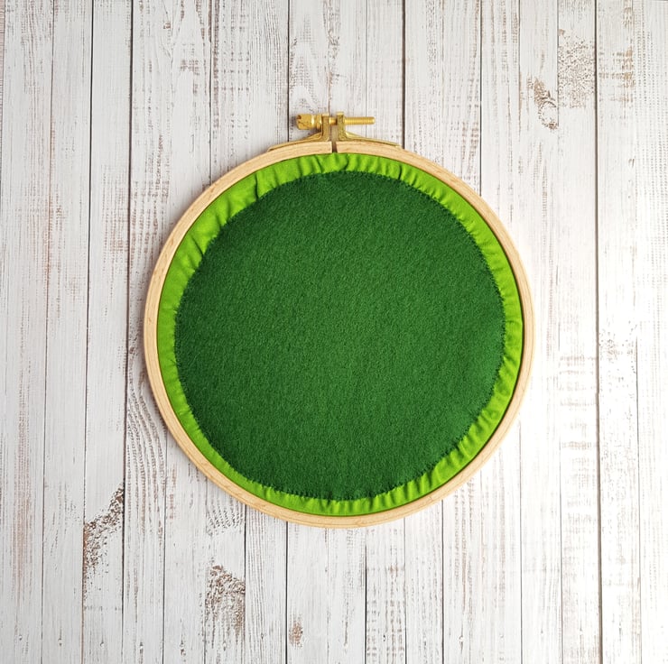 Mounted in a 6.5" (approx 17 cm) embroidery hoop.
