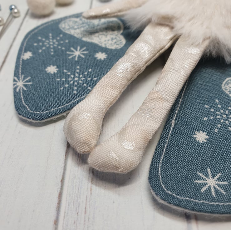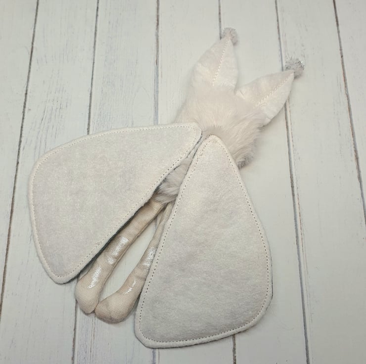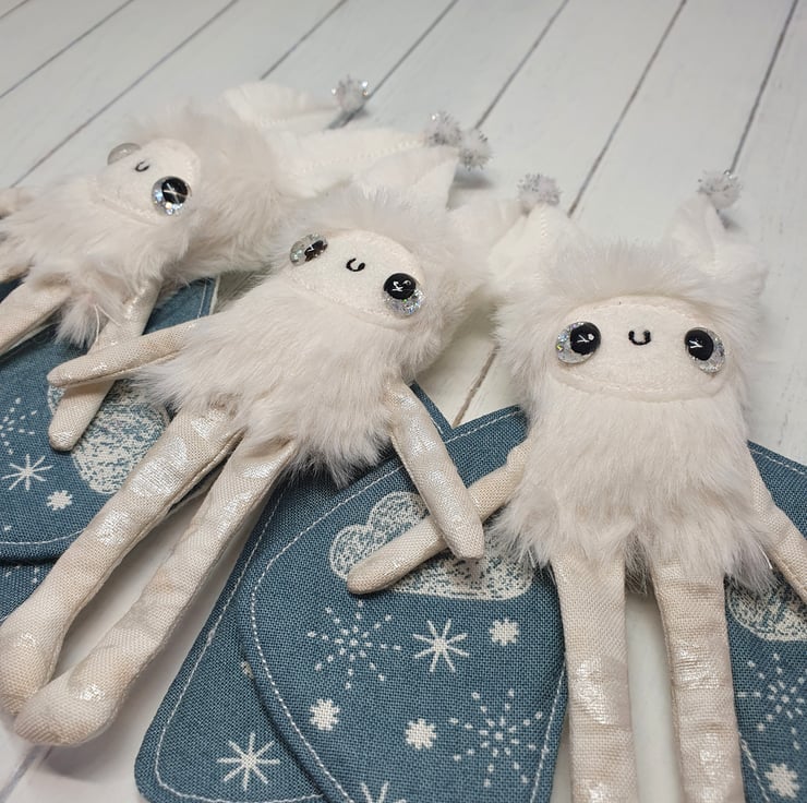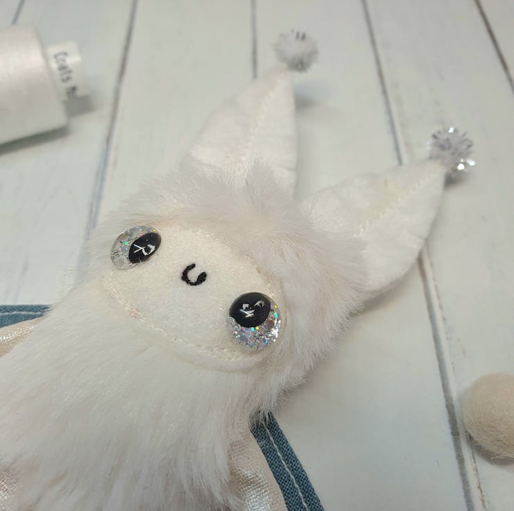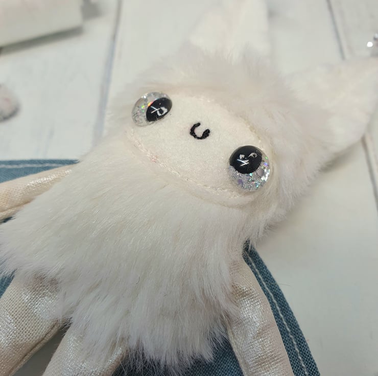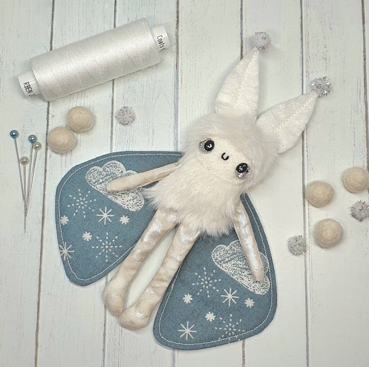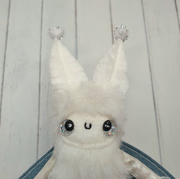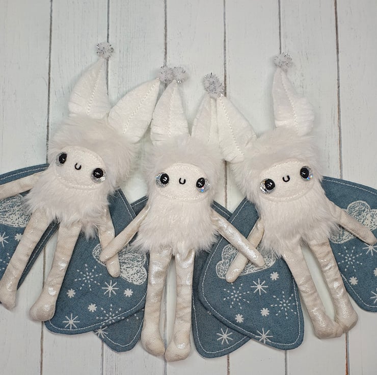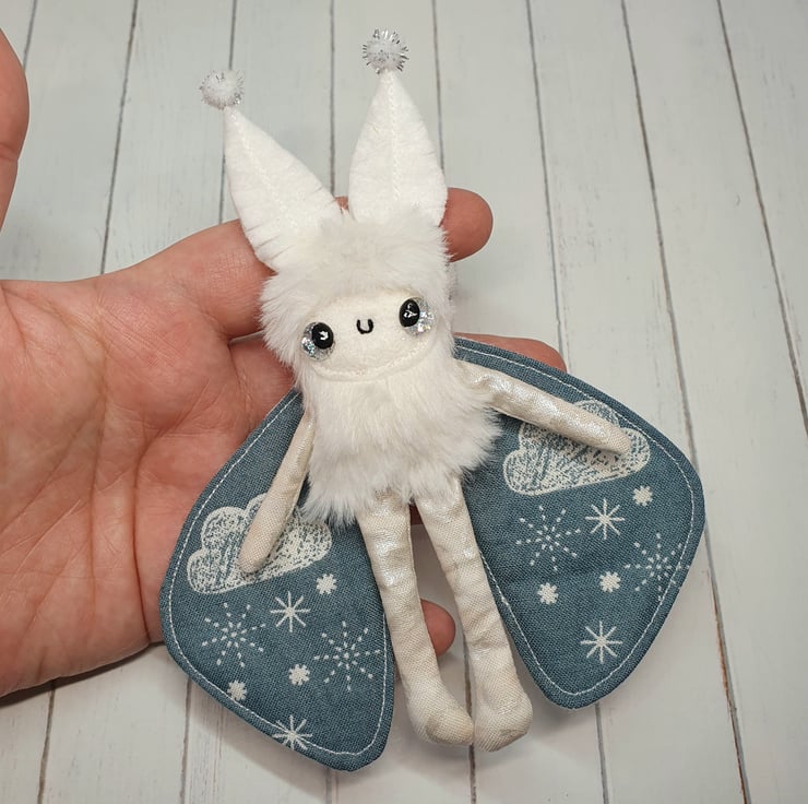Soft plush mothling with felt backed wings and face. Mothling has snow cloud print wings and felt antenna that are hand cut and topped with white and metallic silver miniature pom poms. The arms and legs are multi tonal with pearly shine. The mothling measures roughly 15cm tall with a 12.5cm wingspan and comes.with a transparent loop hanger. This listing is for one mothling only, chosen at random from the three pictured above.