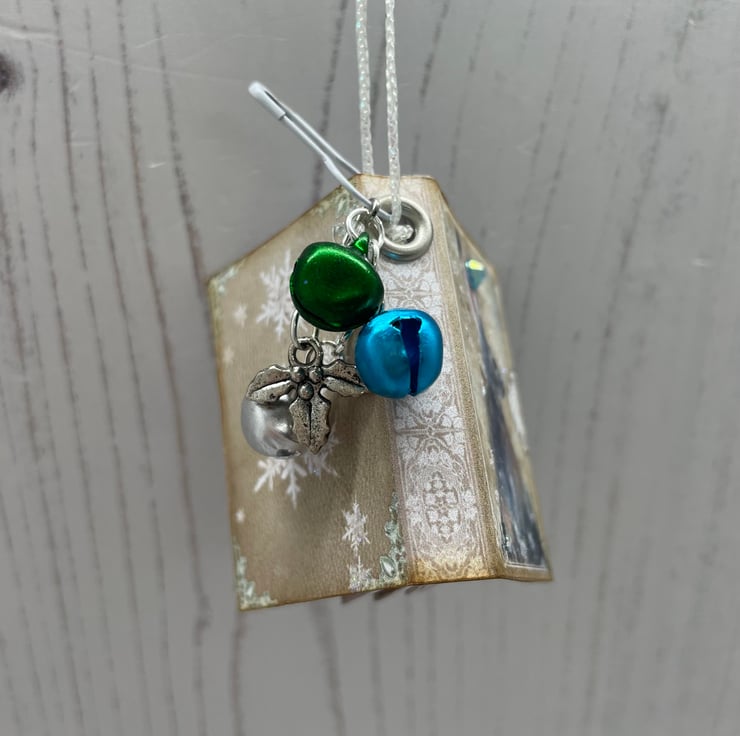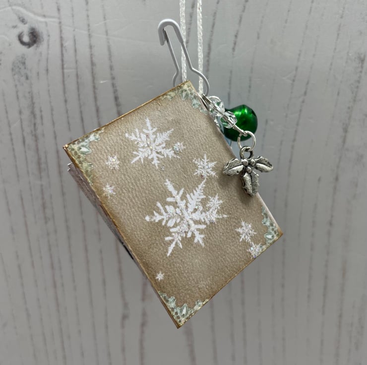 Miniature book with 16 pages with lined paper and seasonal images. Front cover has a touch of glitter with a diamanté to highlight. Side dangle on a white bulb pin has a holly leaf charm with 3 pretty coloured bells hanging on a chain. White glitter cord for hanging on your tree.