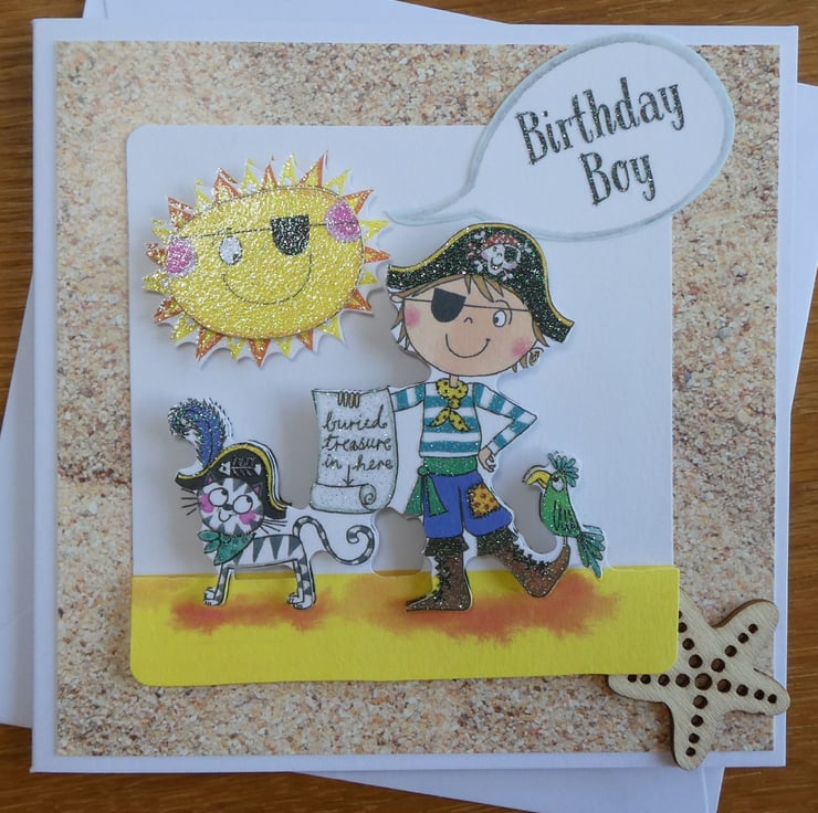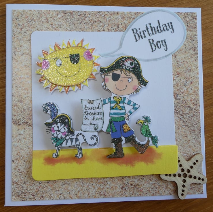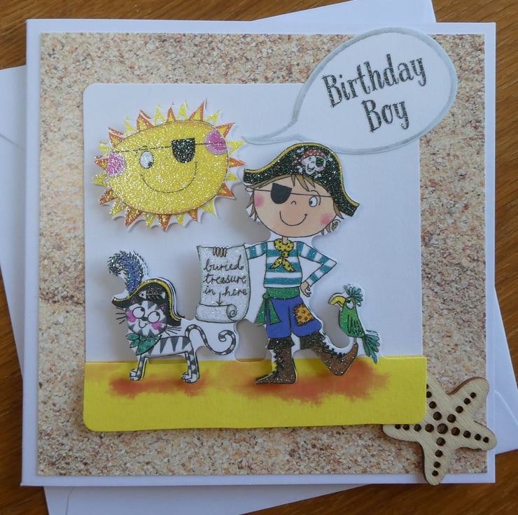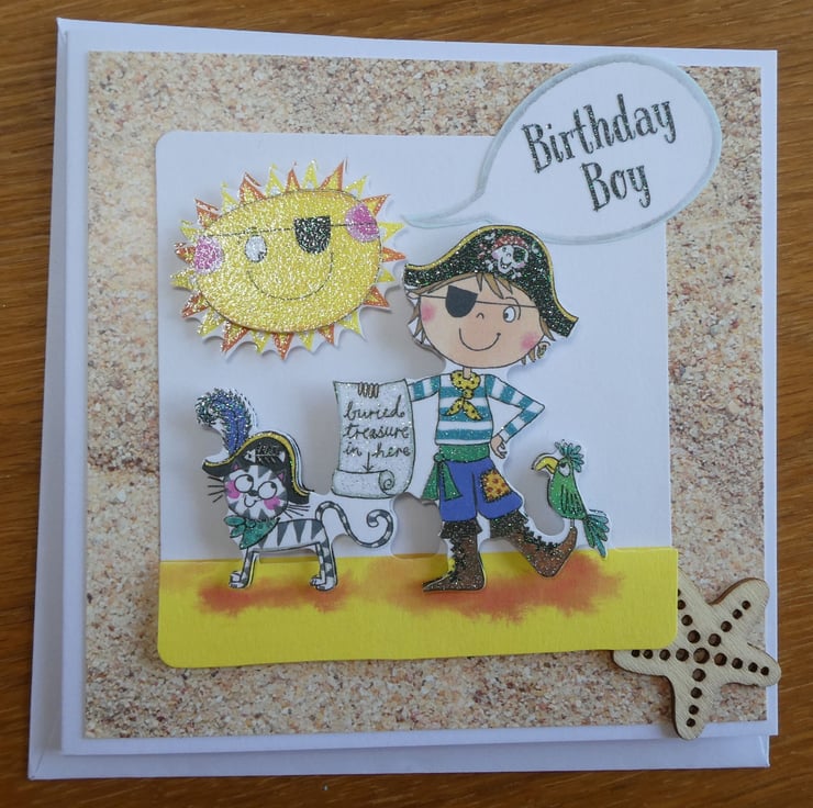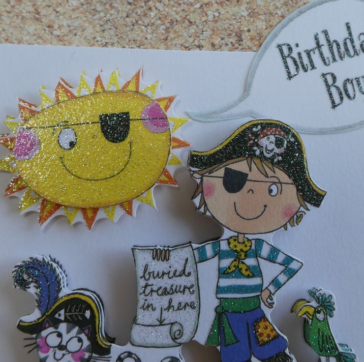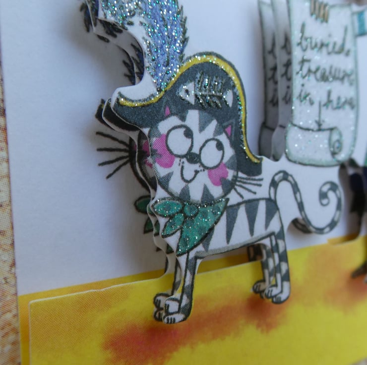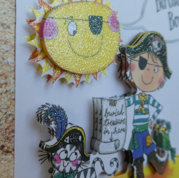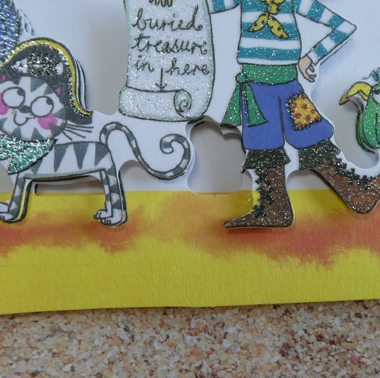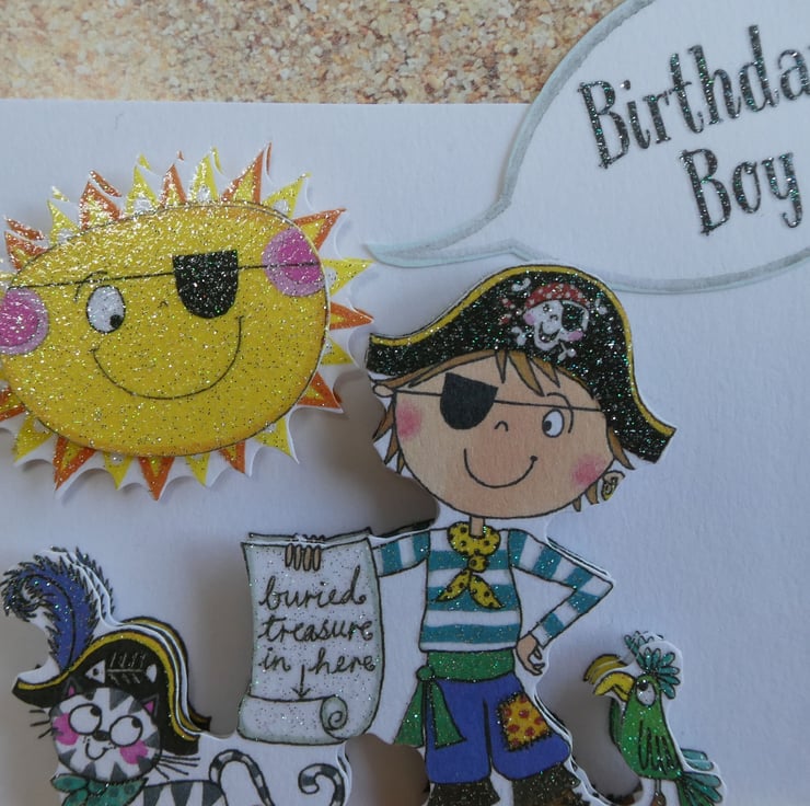 Printed images of a boy dressed up as a pirate with a cat, treasure map and parrot have been built up in layers with foam pads to give a complete 3d effect.
