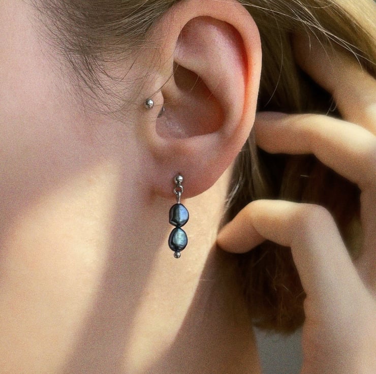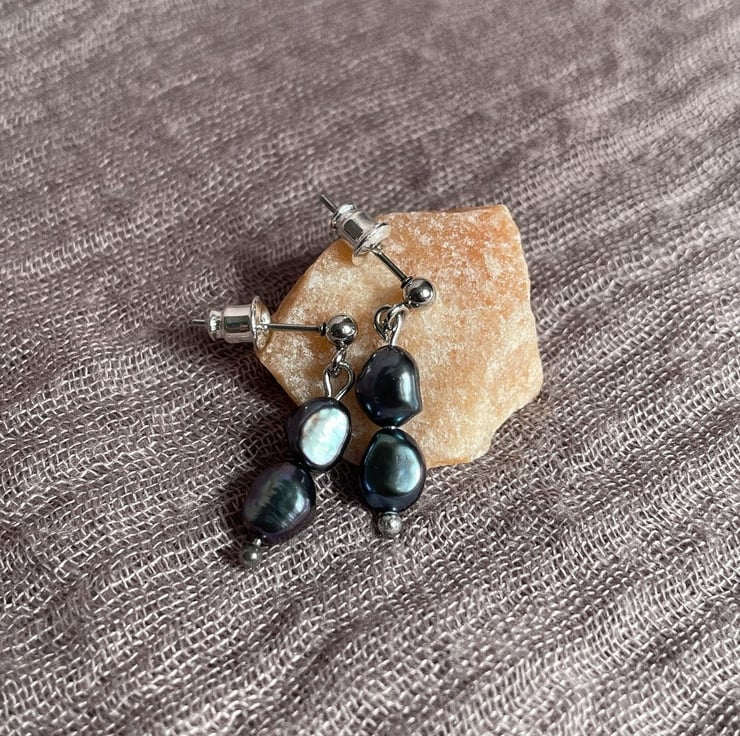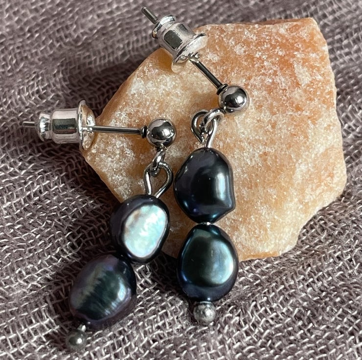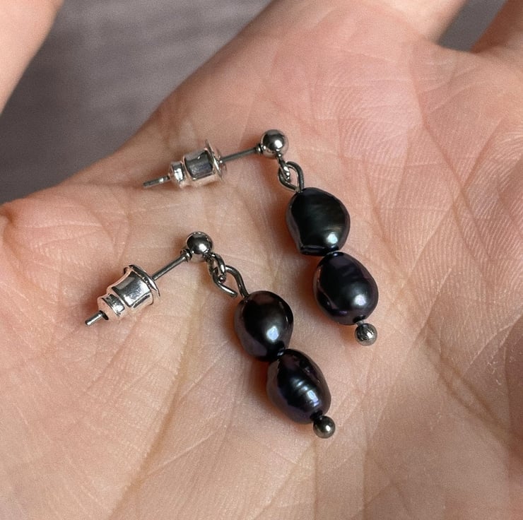 Earrings are made from hypoallergenic stainless steel and black freshwater pearls. Light and great to wear everyday.