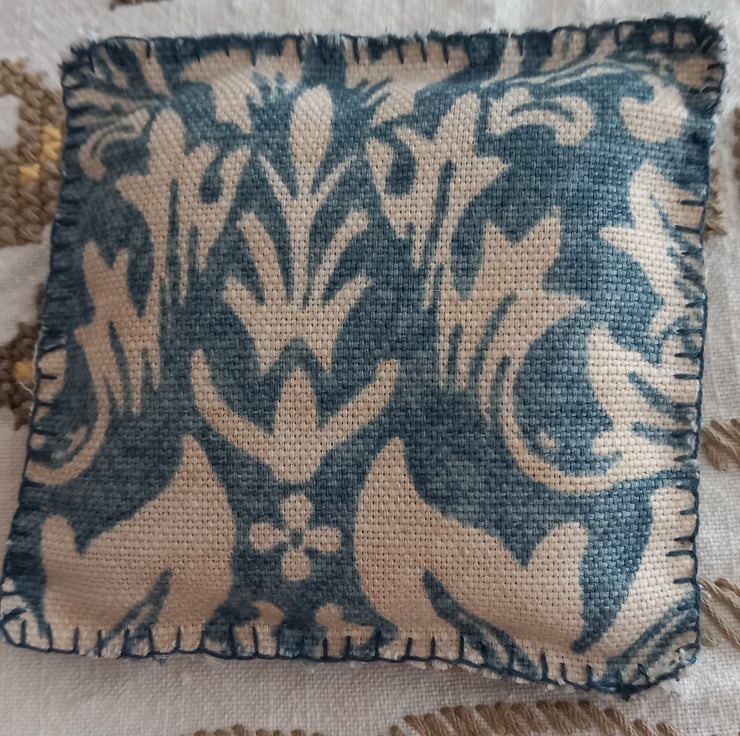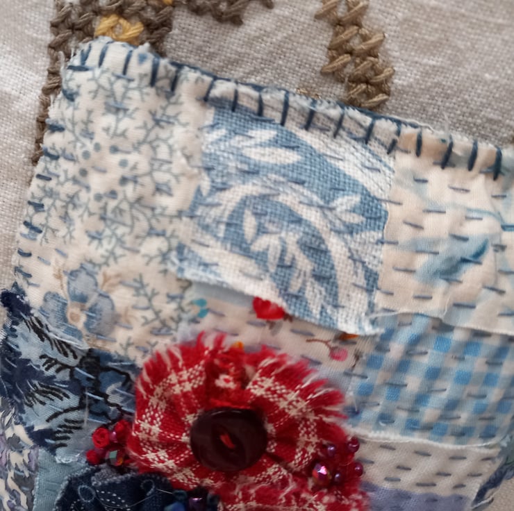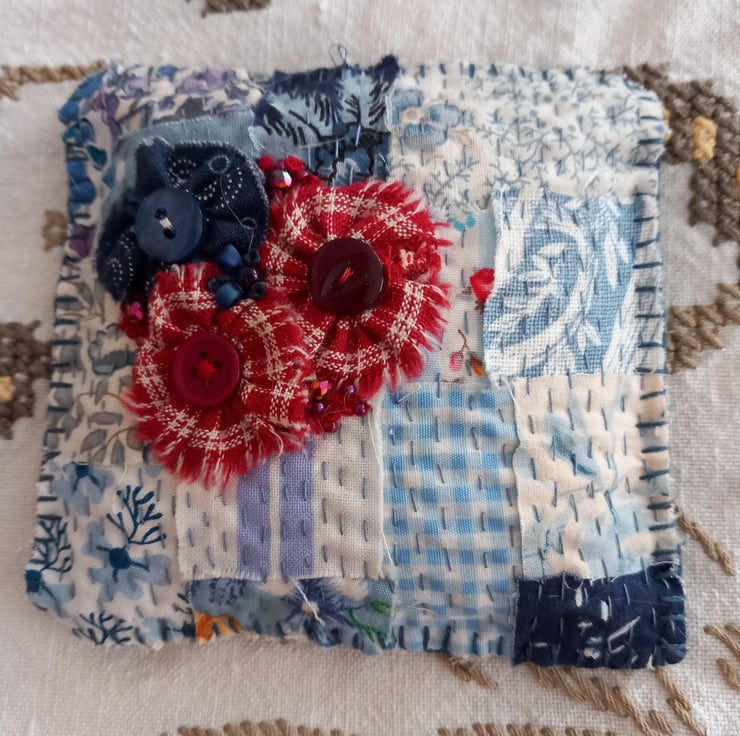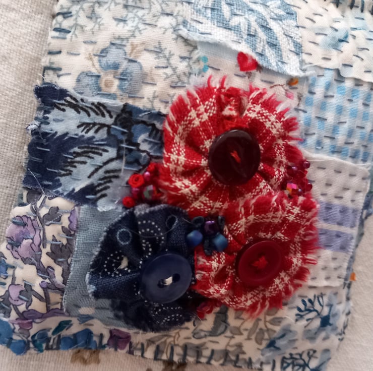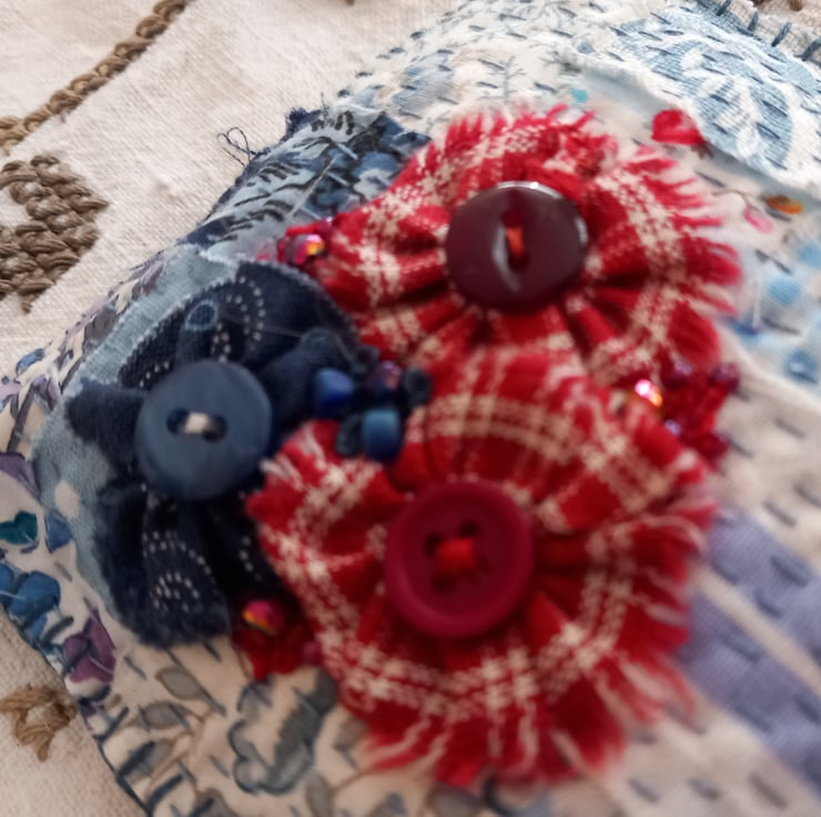 I created the top of this pillow from scraps of a variety of blue patterned fabrics that I kantha-stitched onto a piece of cotton. I then decorated it with 3 rosettes, one blue and two red, made from strips of fabric I also added buttons and beads. The back is made from a furnishing fabric that I attached to the top with blanket stitch. The inside is filled with English lavender from my Father's garden.
