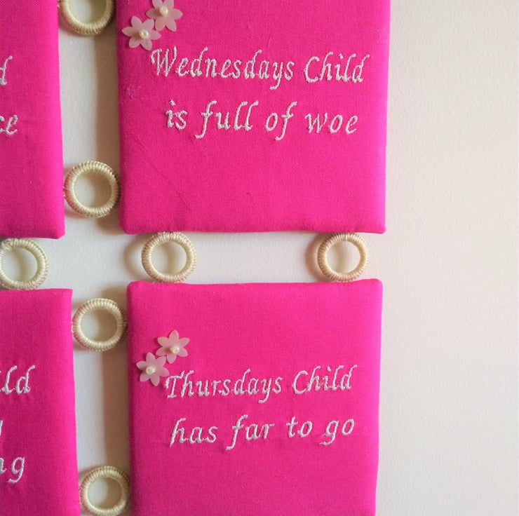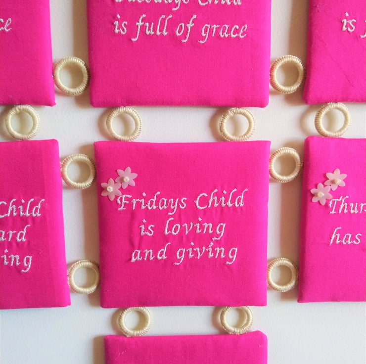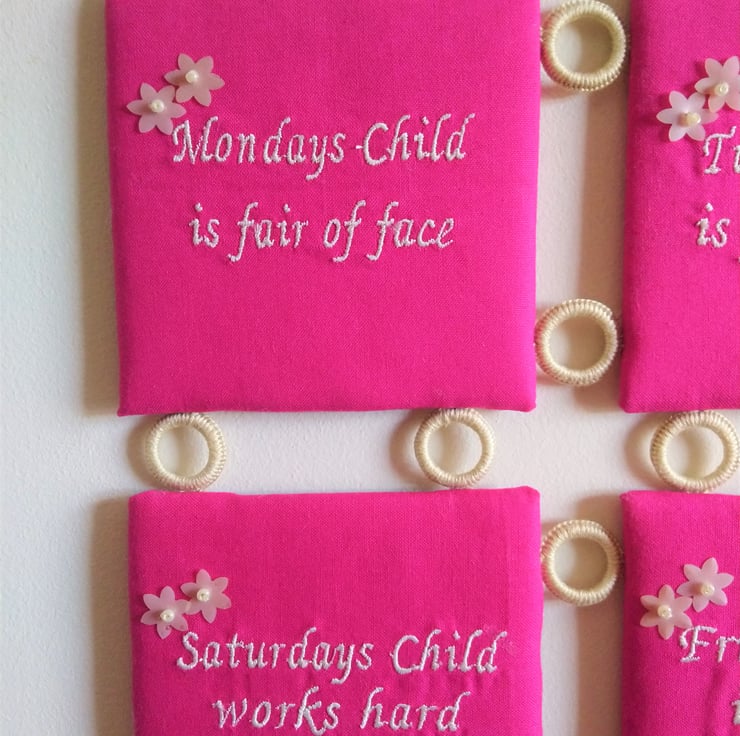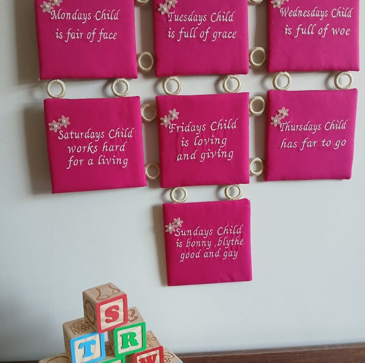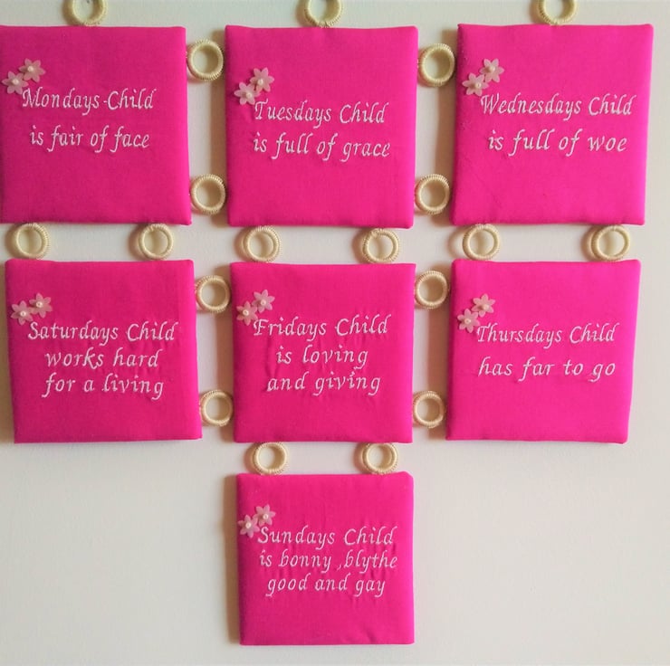 Gift for a baby/childs bedroom. A lovely wall hanging featuring the rhymes of the days of the week that you were born. Each day is a covered board in deep pink with flower embellishment Each day is linked to one another with thread covered rings. Each day Measures 4" x 4" and the whole piece down the the base of Sunday measures 14" x 14". The whole piece is hung by the three rings at the top. Each board is backed with felt to protect your wall