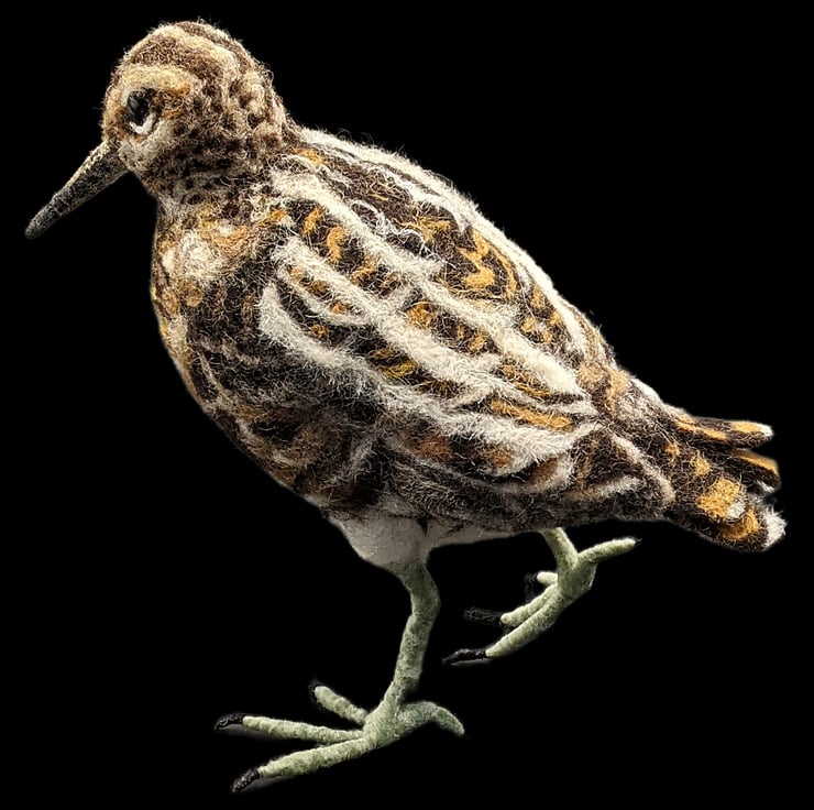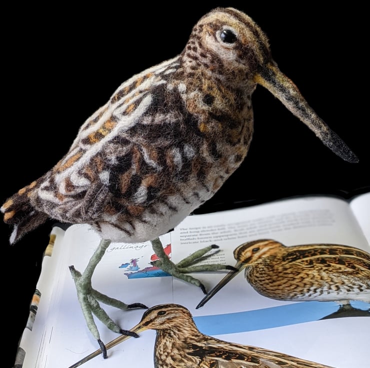 I find water birds fascinating. The Common Snipe is a shy bird and very difficult to see. It has amazing plumage with lines and swirls of colour in order to break up its profile and shape to hide it from eagle-eyed predators. I really wanted to tackle all those patterns and I think it came out beautifully with all the carefully blended wool colours.