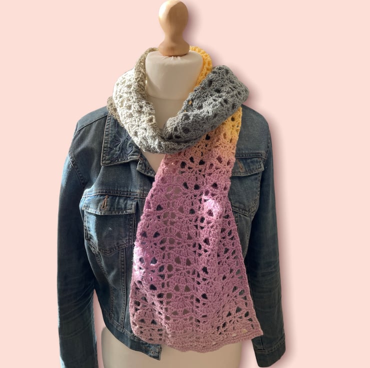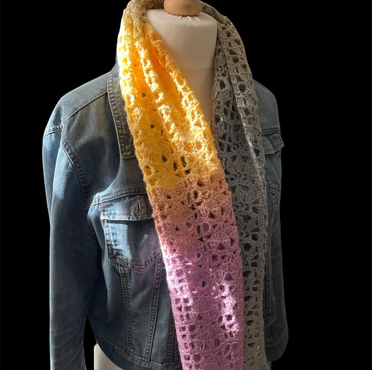Handmade crochet scarf in ombré colours. Measuring approximately 125 cm x 27 cm made in soft acrylic yarn. Ideal gift or treat for winter