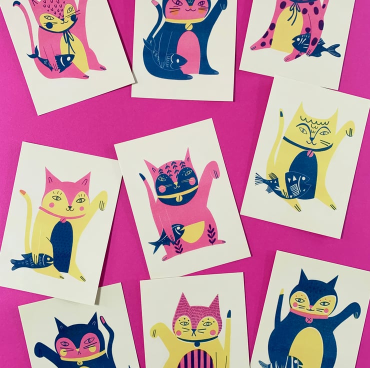 I love lucky cats and for a project a few years ago I drew my collection of them, which I then Riso-graphed with bright pops of colour into these characters. I wanted to produce an alternate to large prints so produced this mini postcard collection!
