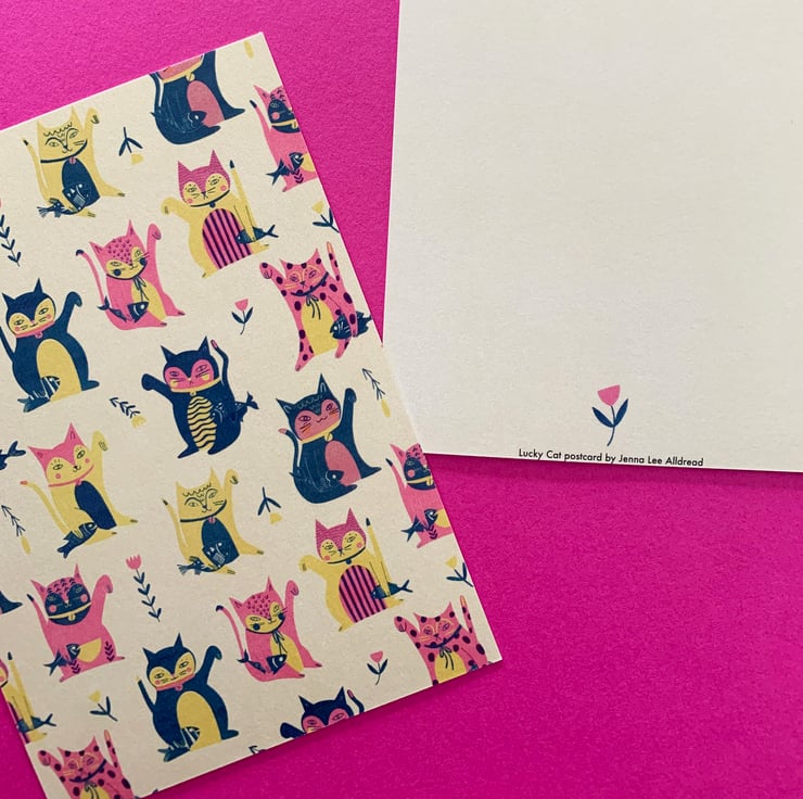 A collection of nine different illustrated lucky cats A6 postcards - reproduced from original Riso-prints. In each pack you'll get three pink cats, three blue cats and three yellow cats.