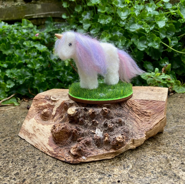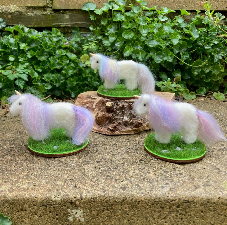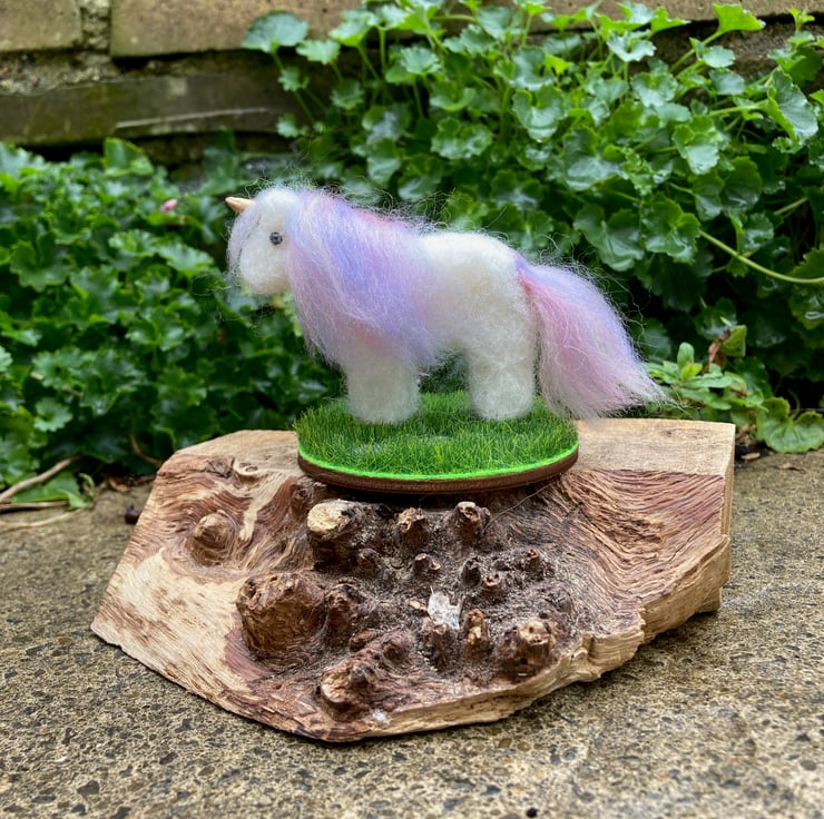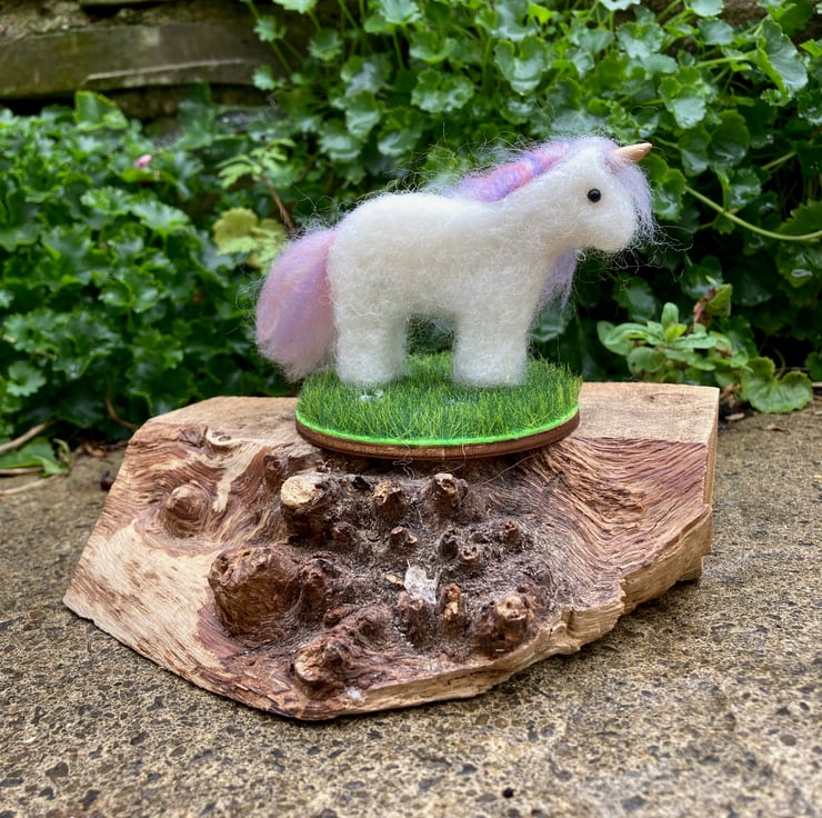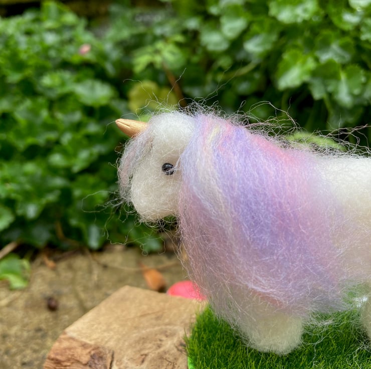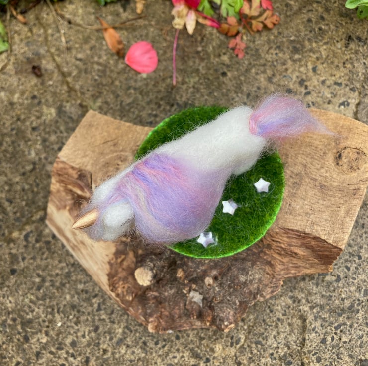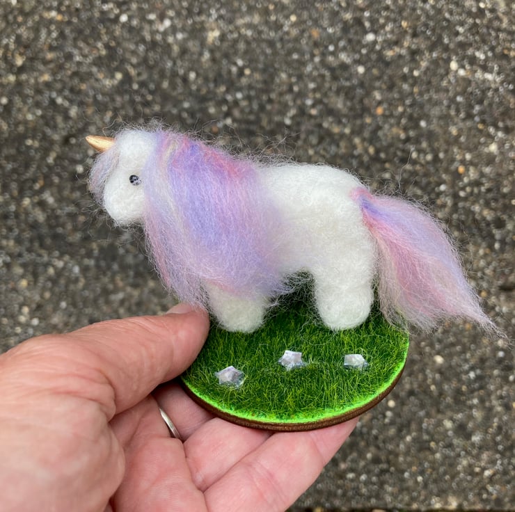 This cute little unicorn has been needle felted using white corriedale woollen fibres and a barbed felting needle. His mane and tail have been added using a pastel blend of merino wool fibres. Silk clay has been used for the horn which has been painted gold and small black half pearls have been added for the eyes. The legs of the unicorn have stiff wire inserted to increase stability. The unicorn has been mounted on a small 7cm diameter wooden plaque which is covered in artificial grass fabric. Pretty acrylic star shaped crystals have been scattered across the grass base.