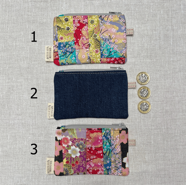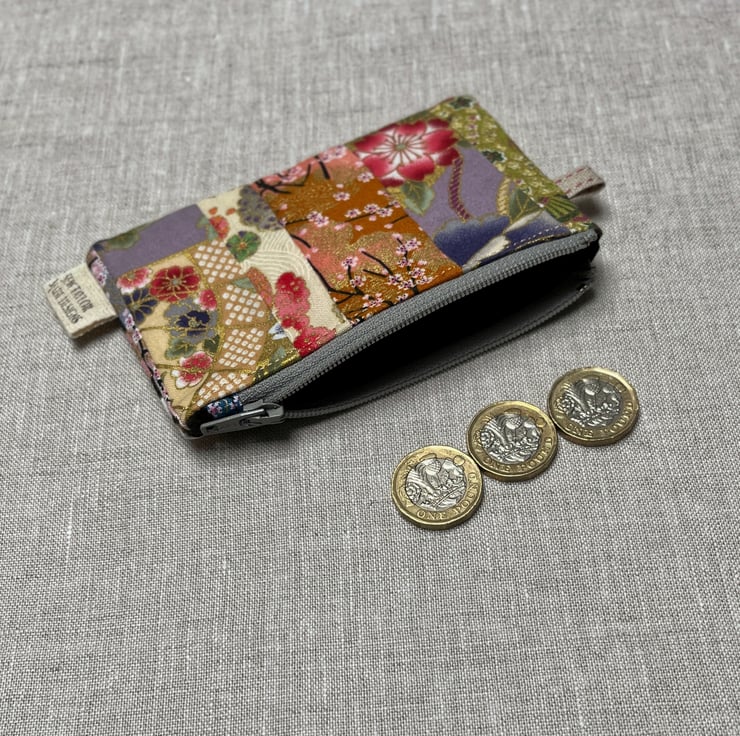 This attractive coin purse has been created from small pieces of Japanese fabric that have been carefully placed and sewn together. It is purse 2 in the numbered pictures.