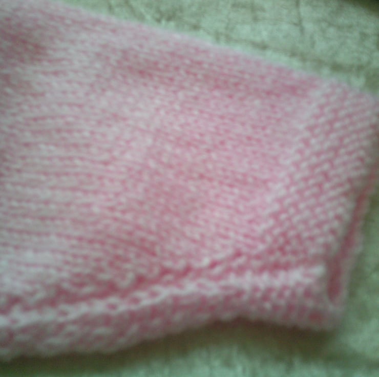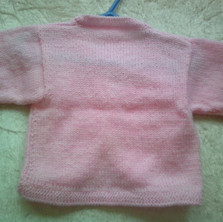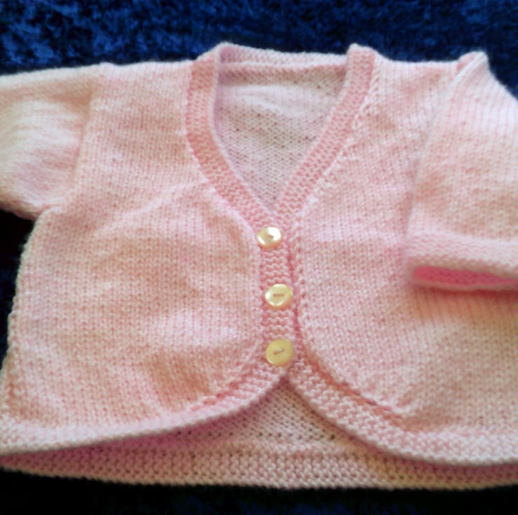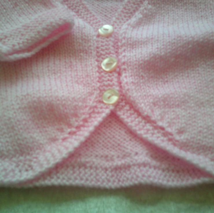 This hand knitted pink acrylic yarn this Bolero style cardigan comes complete with three buttons and would make an ideal addition to any little girls wardrobe.