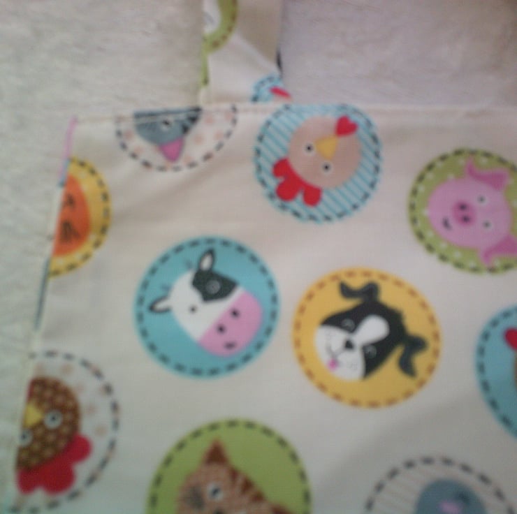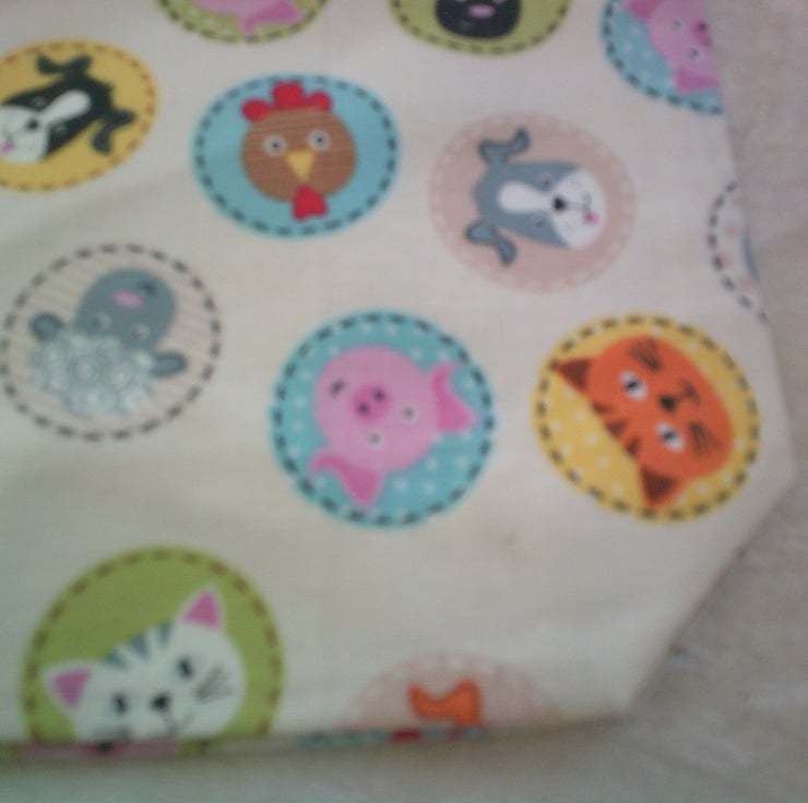 This Childs Handbag Fabric bag is made using a 100% Cotton Fabric featuring animals including cats, dogs, cows, chickens and pigs in colourful circles on a cream background.