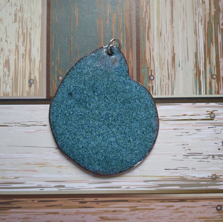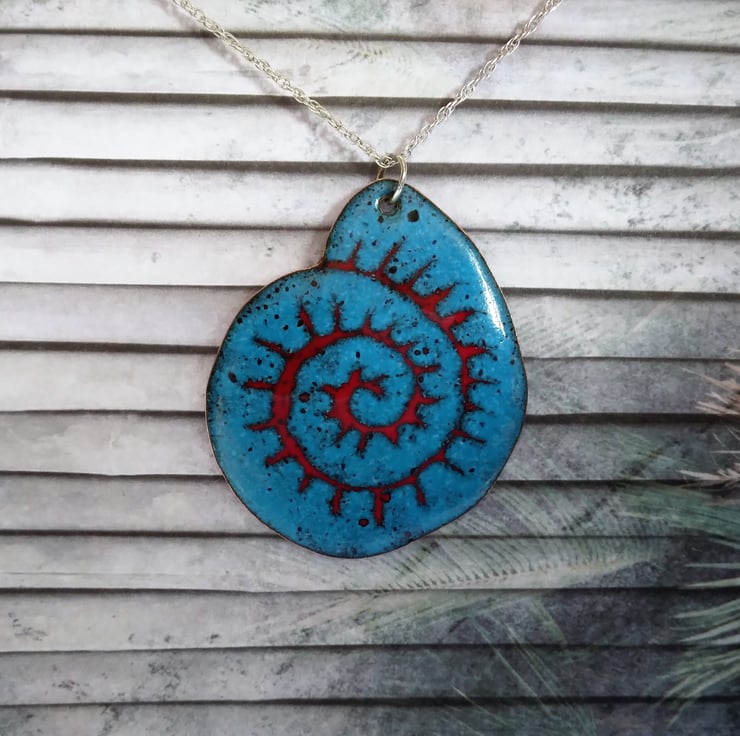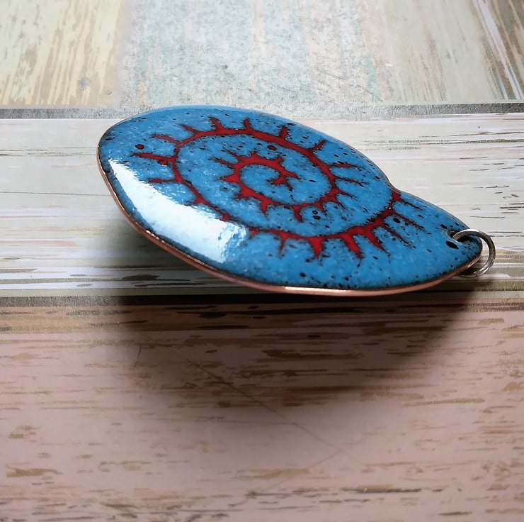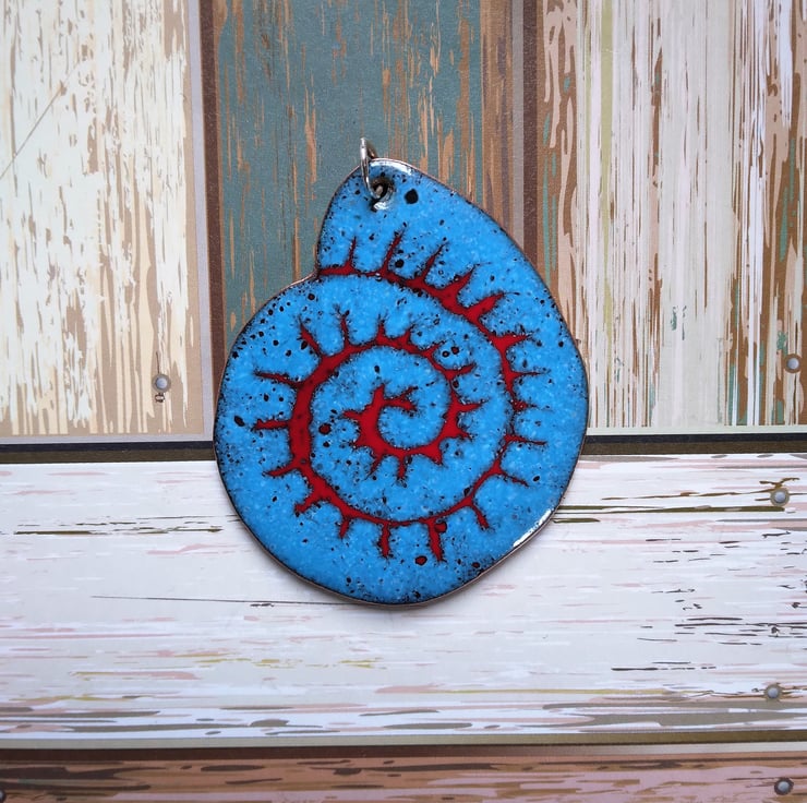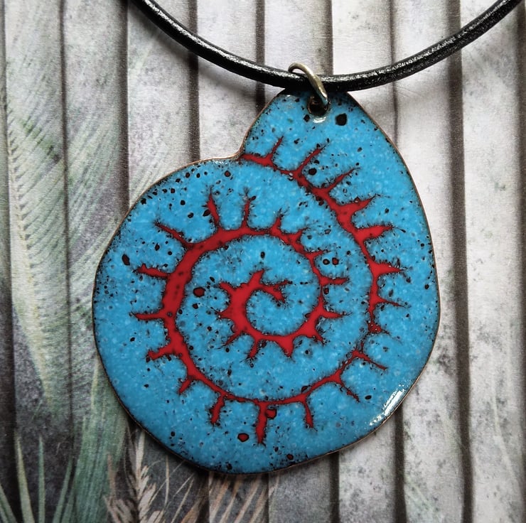 Large, hand-cut, ammonite-shaped pendant with rounded edges on recycled copper, enamelled in red and turquoise. The pendant has been kiln-fired and measures approximately 50mm from top to bottom, and 43mm across the widest part. To complete the piece aesthetically and for a smooth finish against the skin, the back has been given two coats of dark blue tweed-effect enamel. It comes complete with a soldered sterling silver jump ring (6mm) and is supplied with a little organza pouch. An 18” sterling silver rope chain, or a 2mm leather cord (selection of lengths) finished with a magnetic clasp, can be purchased separately from my shop if needed – please see separate listings. If you are using your own chain, please ensure that it will fit through the 6mm jump ring, allowing for the thickness of the pendant.