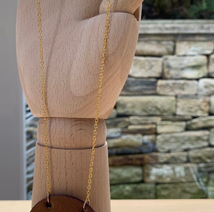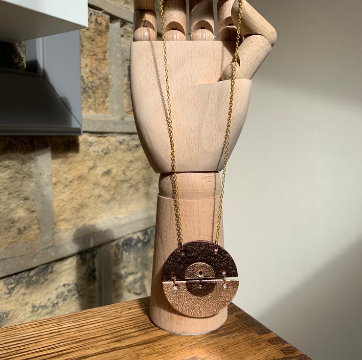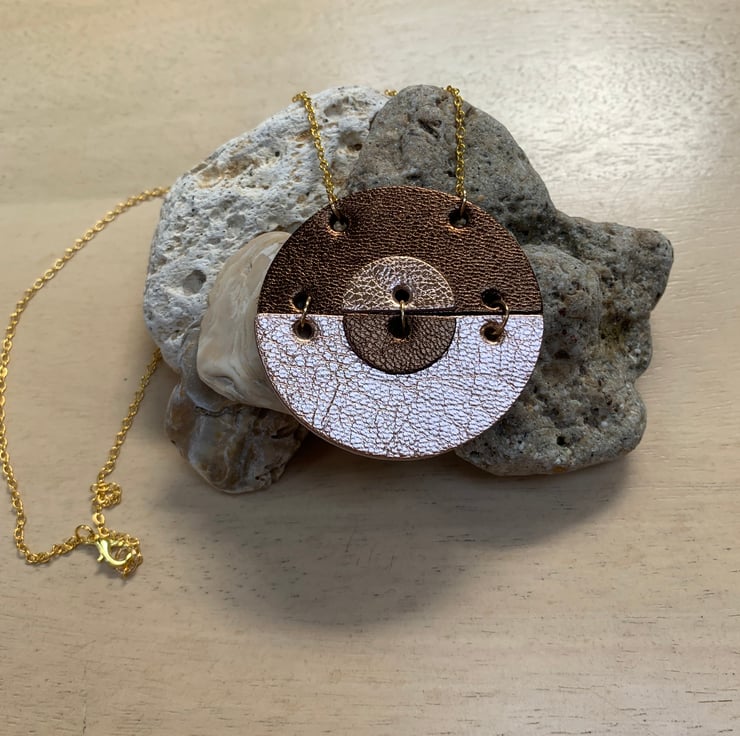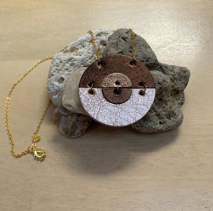 The Hansha necklace features gold and bronze metallic leather.