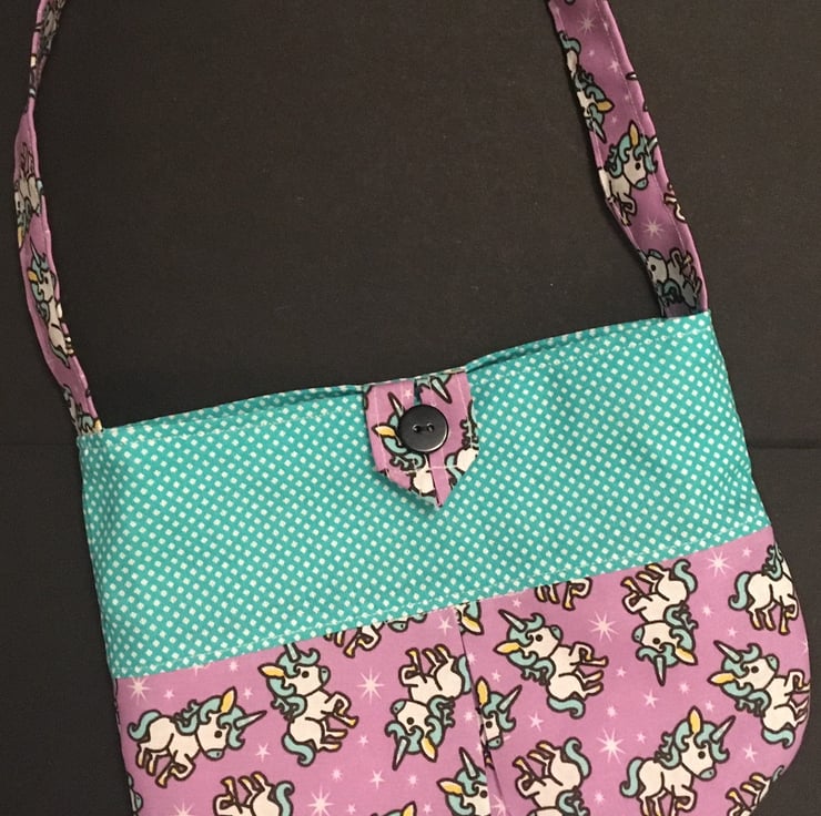Fully lined mini shoulder bag in cute unicorn fabric.