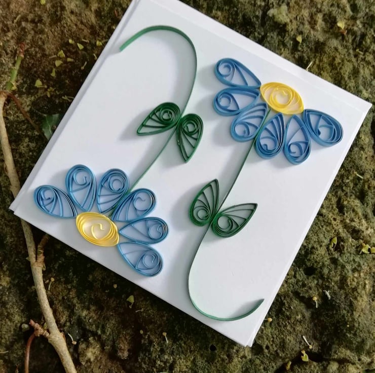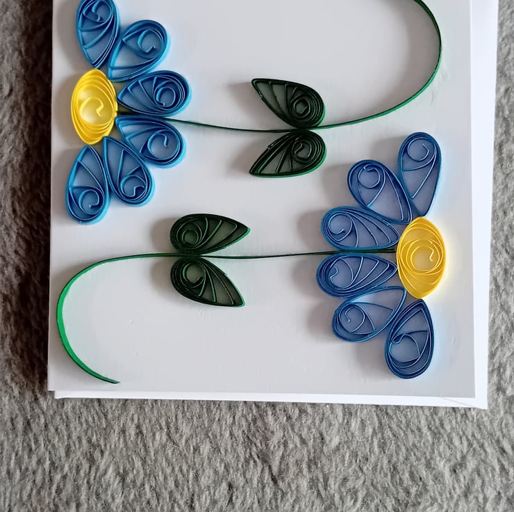 2 quilled Daisies in blue and yellow. They are made with 3mm wide paper strips in blue, yellow and green and they have been rolled, shaped and glued in place. The card is white 4x4 inches and comes with matching envelope. It’s blank inside to enable you to put your own personal message. Will be sent by Royal Mail 2nd class in a padded envelope.