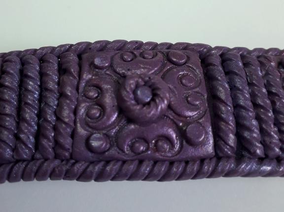 I have first covered a metal blank with the purple clay and then added more on top to form the pattern of swirls, dots and twists, I have lightly brushed mica powder over the top which gives the design a bluish metallic tint in places, and finished with a light coat of varnish to highlight the colours.