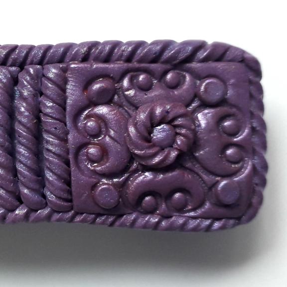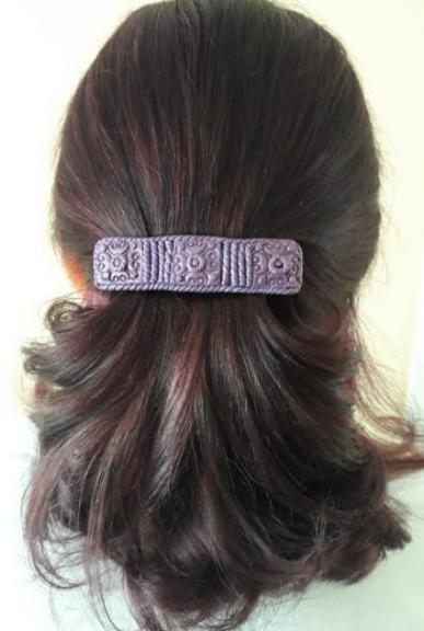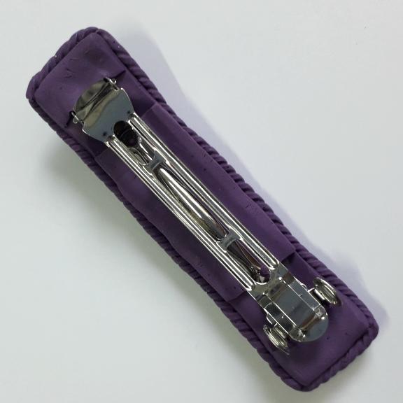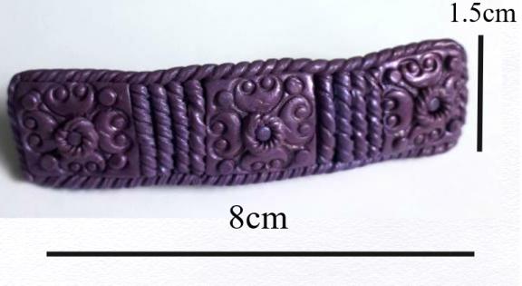 This purple polymer clay hair barrette is 8cm x 1.5cm.