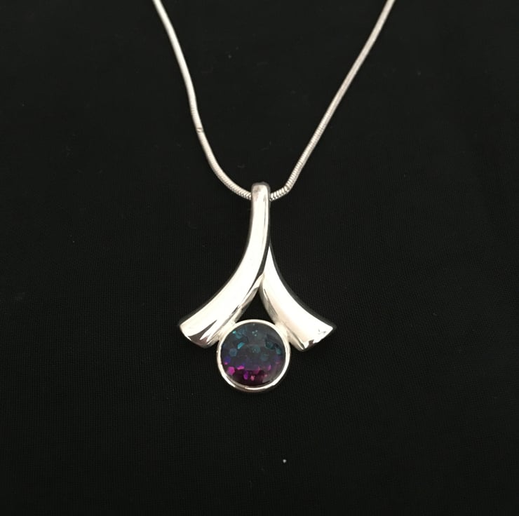 The handmade centrepiece is created using a tri-colour base with a 2 part resin mix overlay. The colours gently reflect the light and therefore can be worn as day or evening wear. There are matching earrings in my shop.