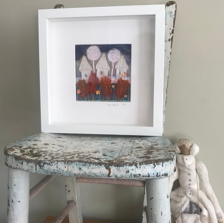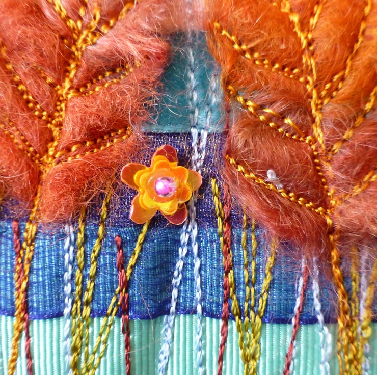 A rich image reminiscent of the colours of autumn. Deep blues, white and russet create the main hues. Felt, organza shot with gold, grey chiffon, wool-tops and cut felt shapes have been layered and machine embroidered to create a complex and exciting image. The use of a heat gun to melt back through the layers has further enriched the surface detail and texture finally embellished with sequins and beads to add glints of shimmer. The image is framed in a 23cm x 23cm white wood frame 4.5cm deep. The frame is deep enough to stand safely unsupported or the bracket on the back can be used to hang the image if preferred.