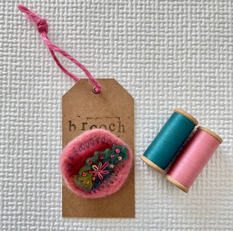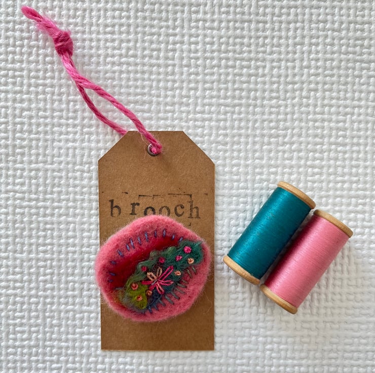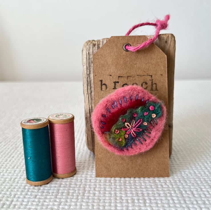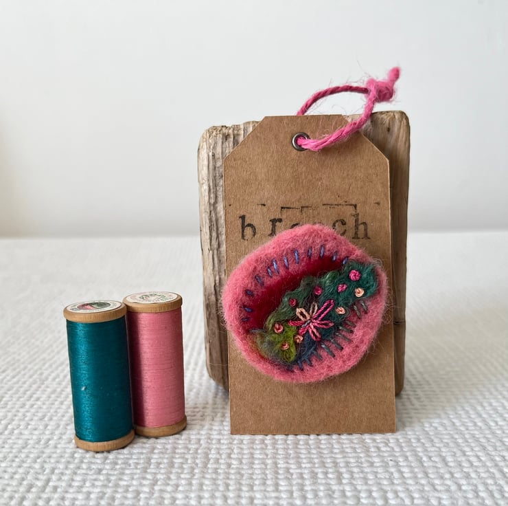 This circular brooch has been made by needle felting wool before hand embroidering a design into the wool using embroidery threads. The embroidery adds splashes of colour to the background.