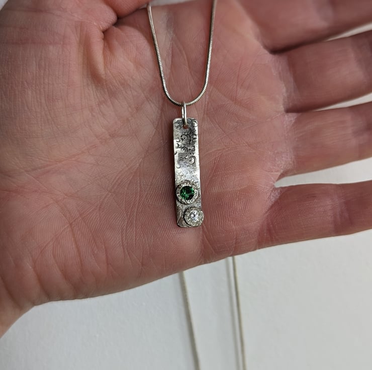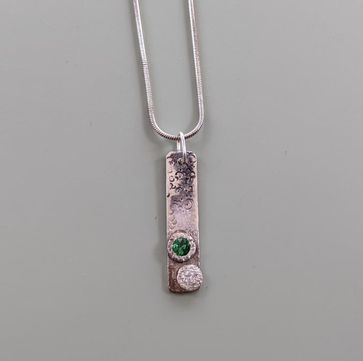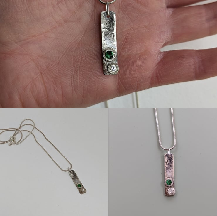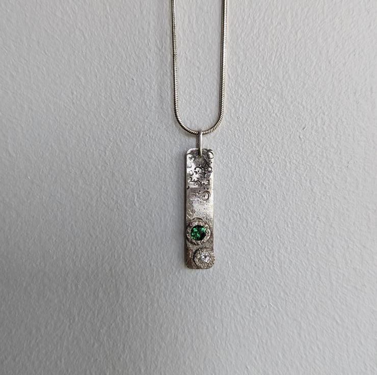 The slimline swatch of textured and oxidised silver creates an aged and weathered backdrop for the two glass stones, each set in a textured bezel. This pendant is perfect for something "a bit different" - it is lightweight and quirky. (There is also a ring in this same style available to match).