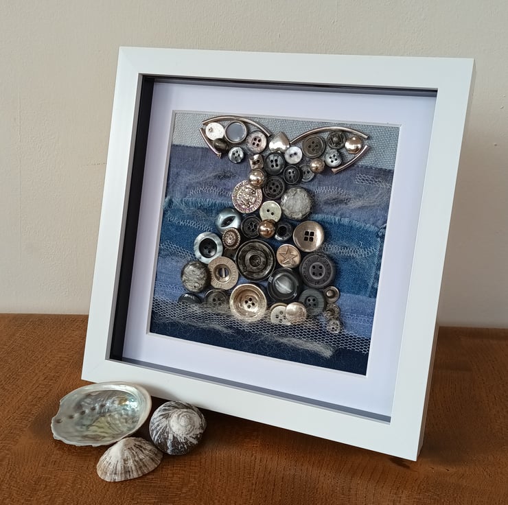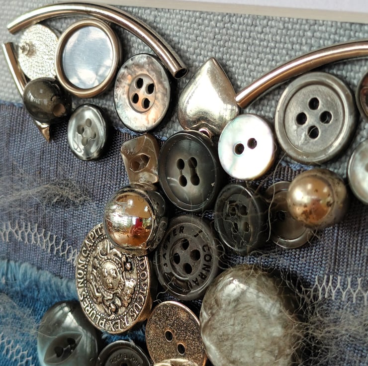 This grey whale is made with spare buttons, you know the ones that come in tiny plastic bags attached to new clothes. The buttons add shape, texture, light and colour as the whale dives in to the ocean. The sea is made with remnants including denim and silk, with bits of net food packaging creating the waves.