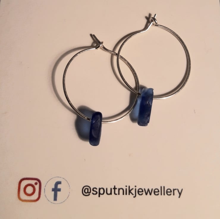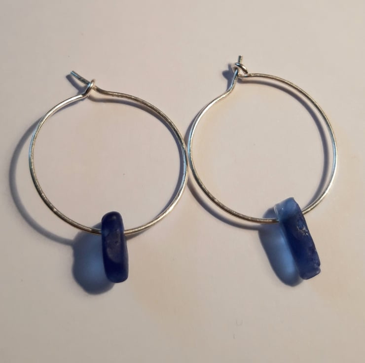 These simple silver loops feature small pieces of blue seaglass washed up on the shores of France. The loops are 2cm diameter and the seaglass shards are approx 1cm long and a gorgeous shade of deep blue.