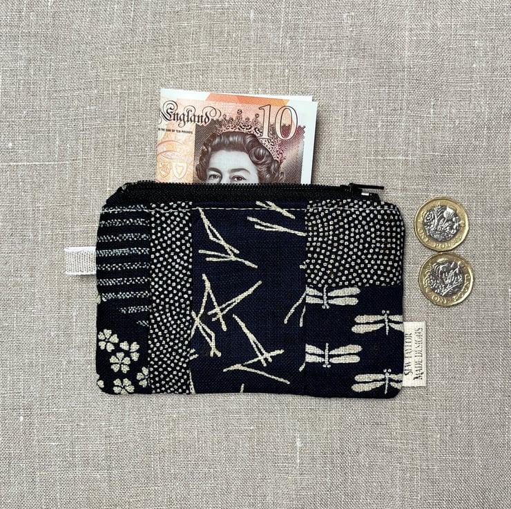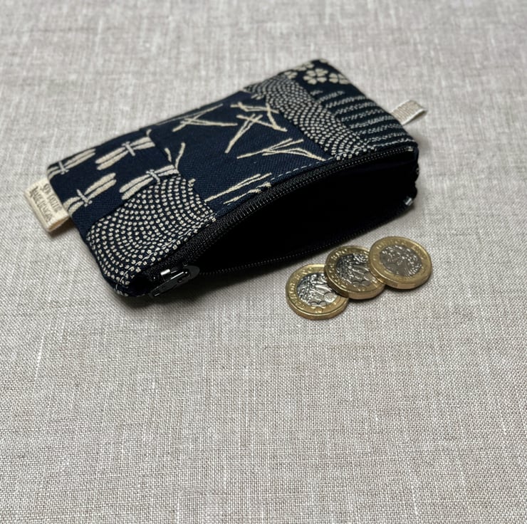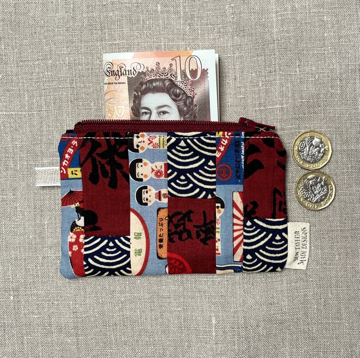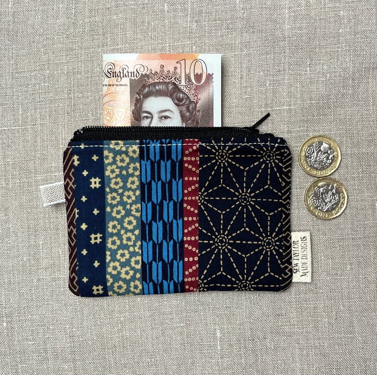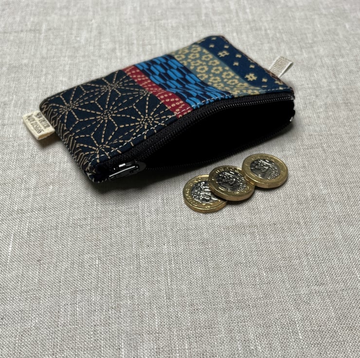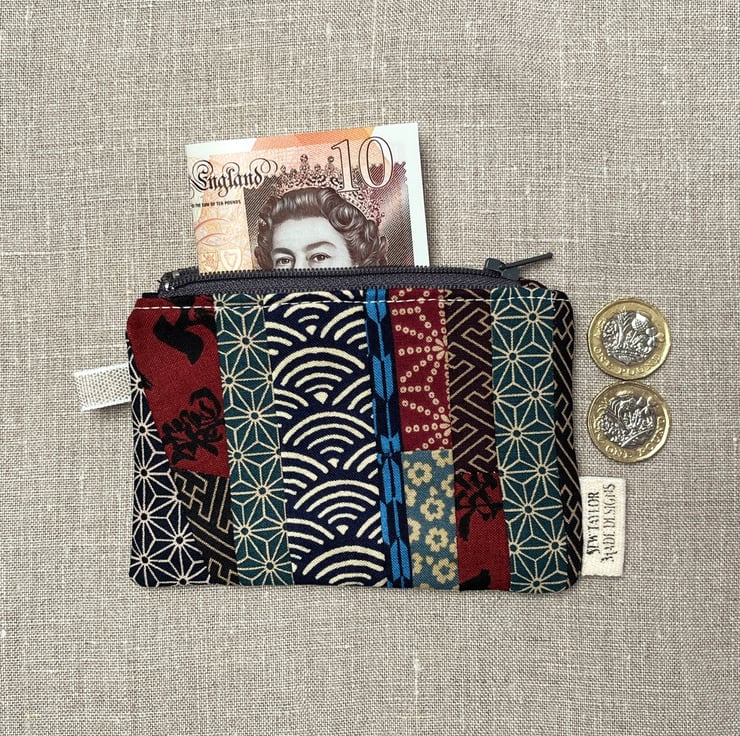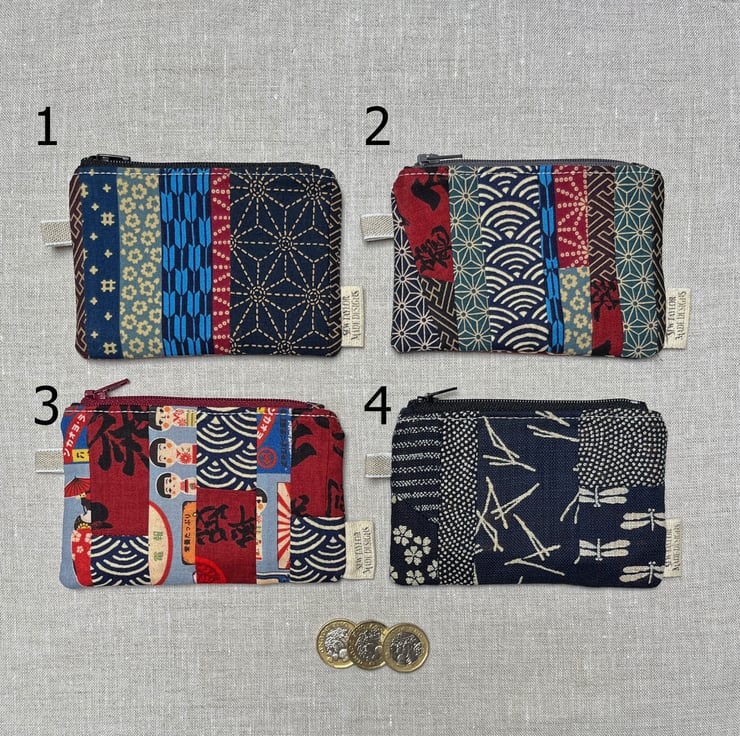 These stylish coin purses have been created by quilting small pieces of Japanese fabric, carefully placing pieces to complement each fabric.
