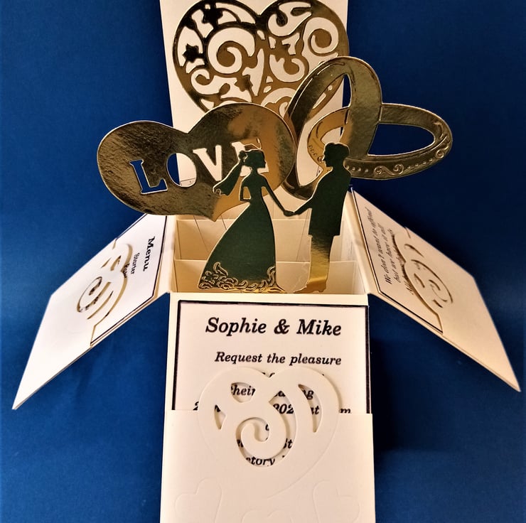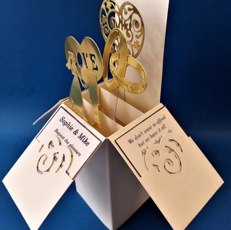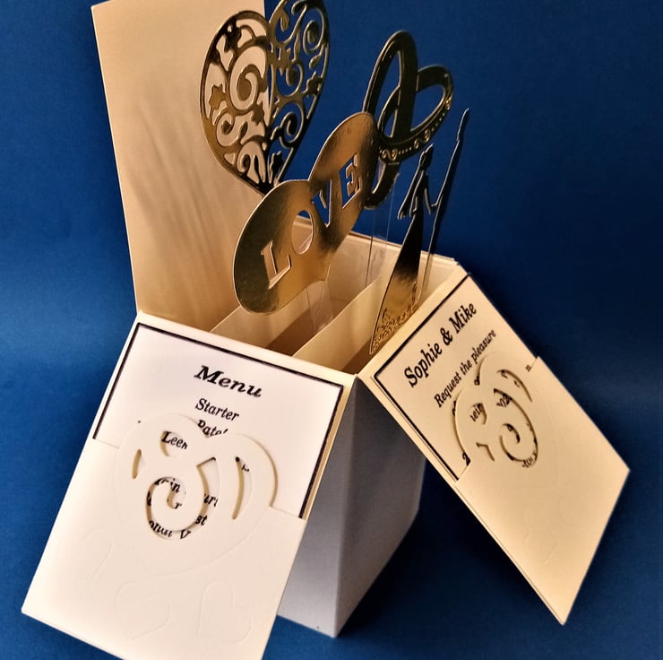 This handmade unique wedding invitation is a complete invitation all on one box. The main box colour is either white or cream but the rest can be made in the colours of your choice. This version is cream on cream with cream inserts complemented with gold toppers.