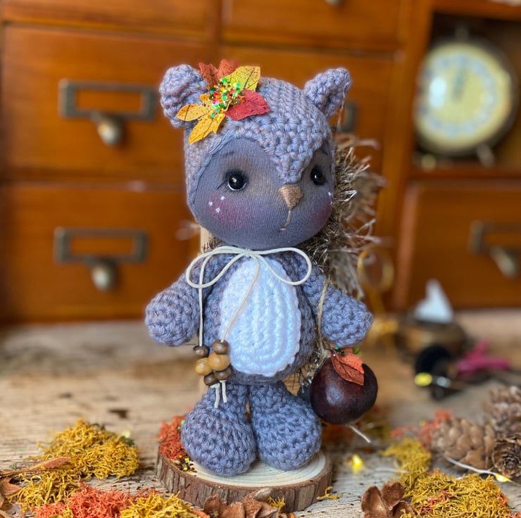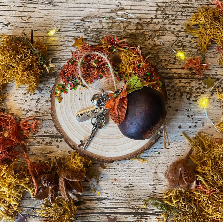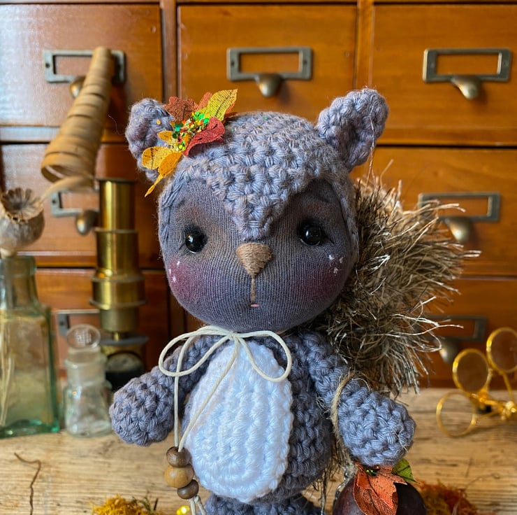Around Girvin's neck is a hemp string tie with wooden beads and on his head is a decorative motive of leaves and glitter, these cannot be removed. He is carrying a small faux conker decorated with matching leaves, glitter & charms.