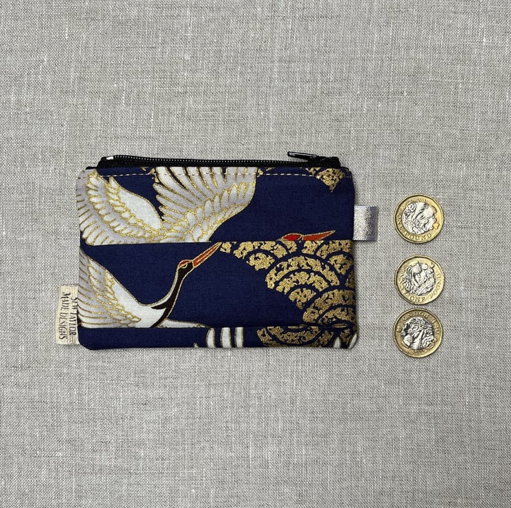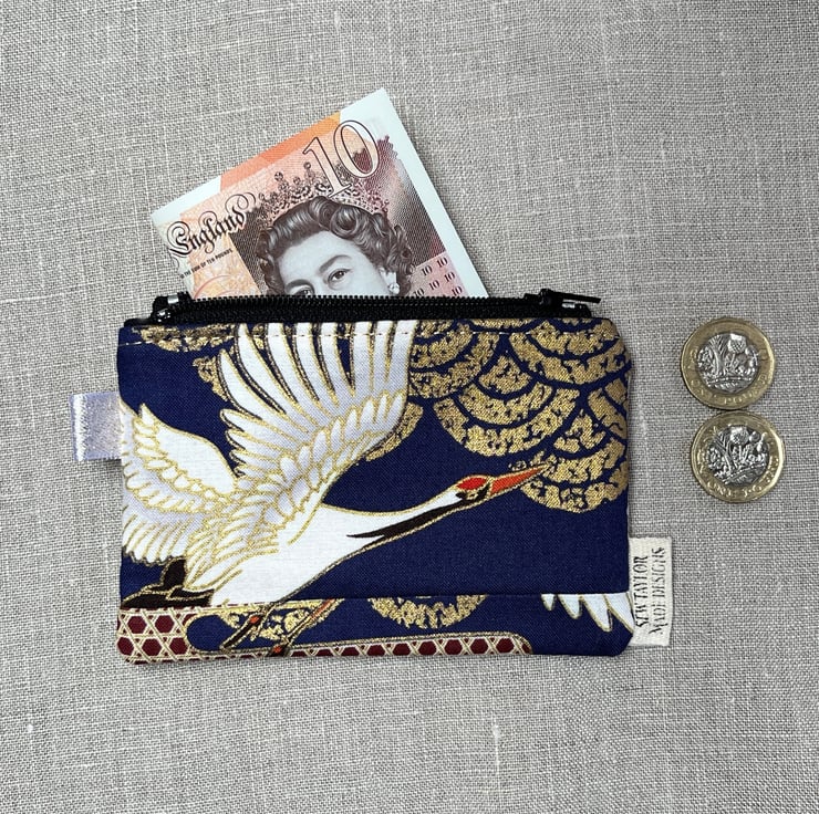 An elegant Japanese crane in flight adorns the front of this coin purse.