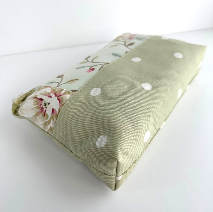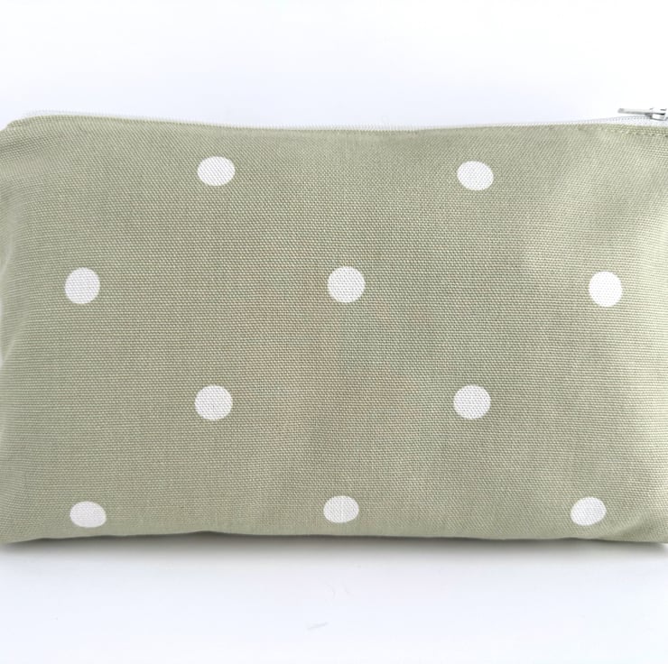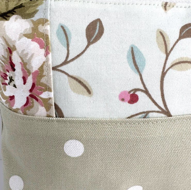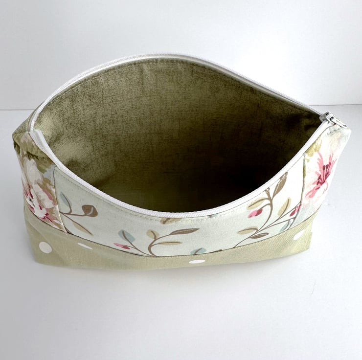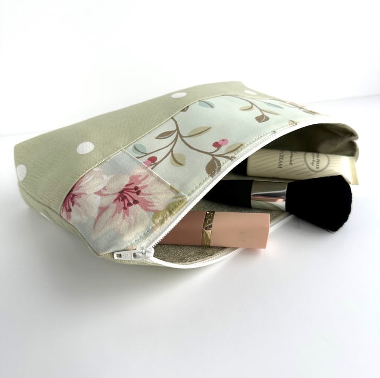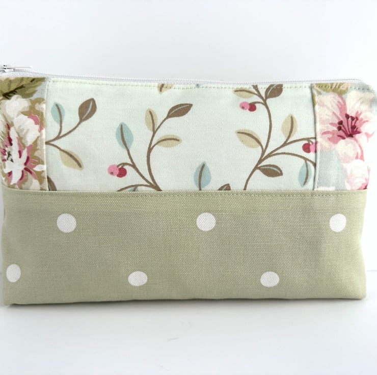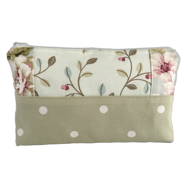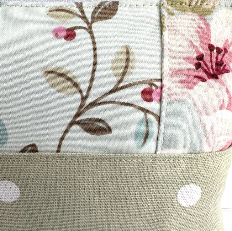 This lovely large sized make up bag is made from three pastel co-ordinating print fabrics. The front of the cosmetic bag has four panels. The upper part of the front of the bag is made up of a central panel flanked by two smaller panels. The central panel features a delightful pattern of leaves and berries depicted in pastel shades of sage green, pale green, pale blue, pink and red, on a pale duck-egg blue background. The small flanking panels are both made from a floral print fabric in shades of pink, white and sage and olive green on a pale blue background. The lower section of the front, and the entire back, are made from pale green fabric with white polka dots. The make up bag fastens with a white zip and is lined with pale green fabric with a mottled sheen. The base of the bag is boxed giving lots of space inside.