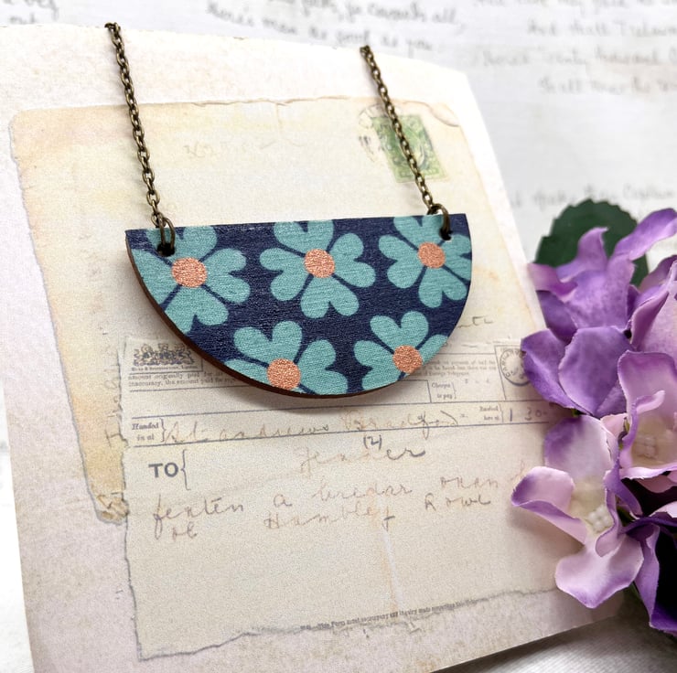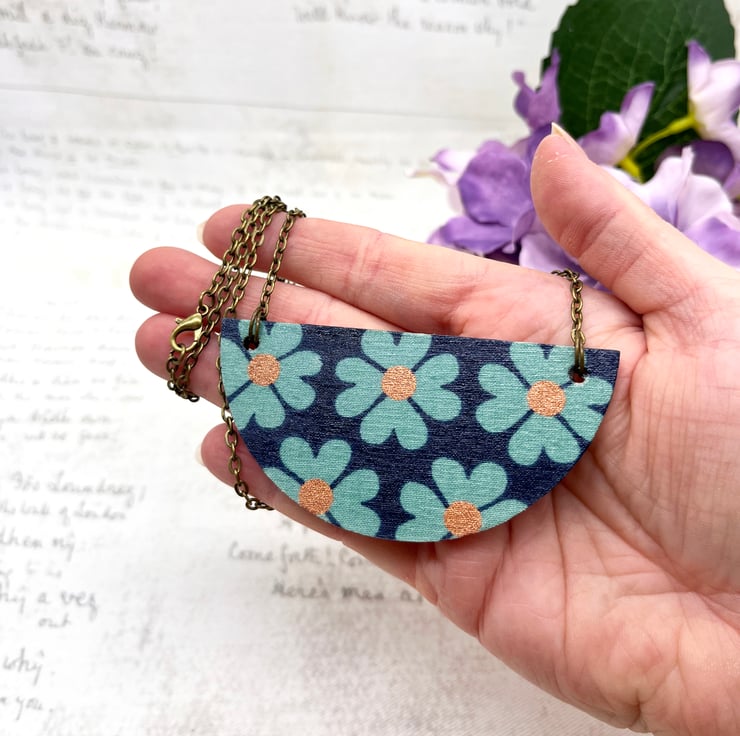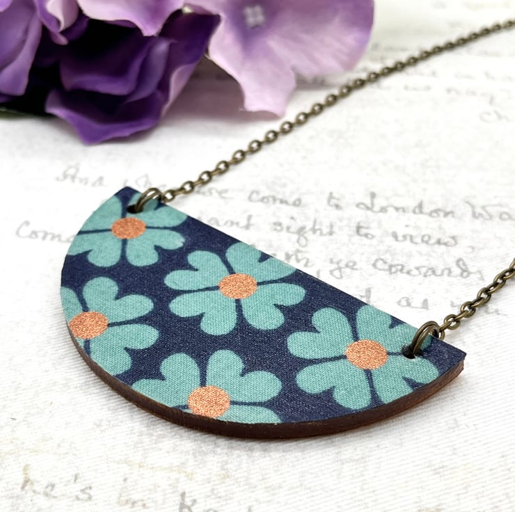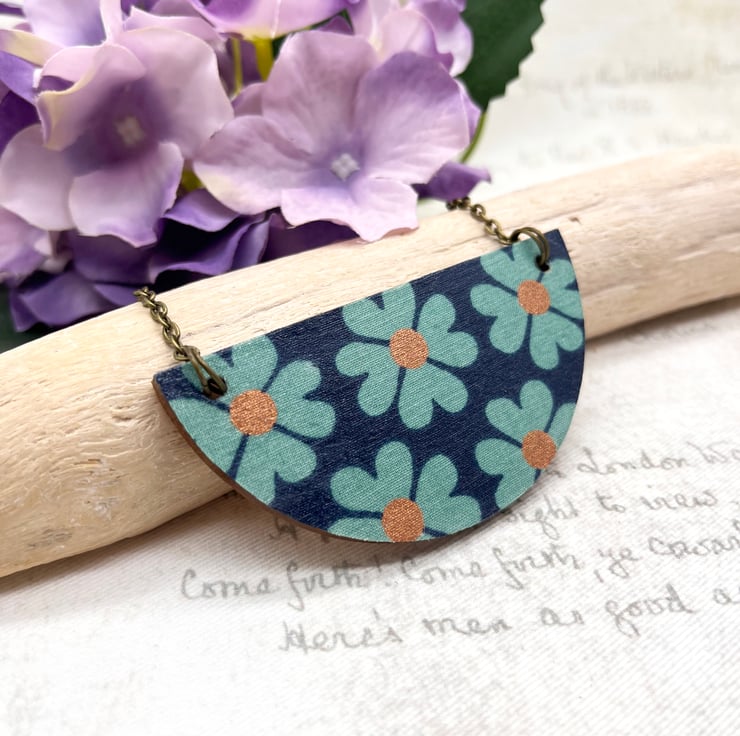 For this necklace, I’ve selected a section of these lovely flowers, cut and secured it to a semi-circular FSC approved plywood shape, using specialist fabric coating medium and varnish.
